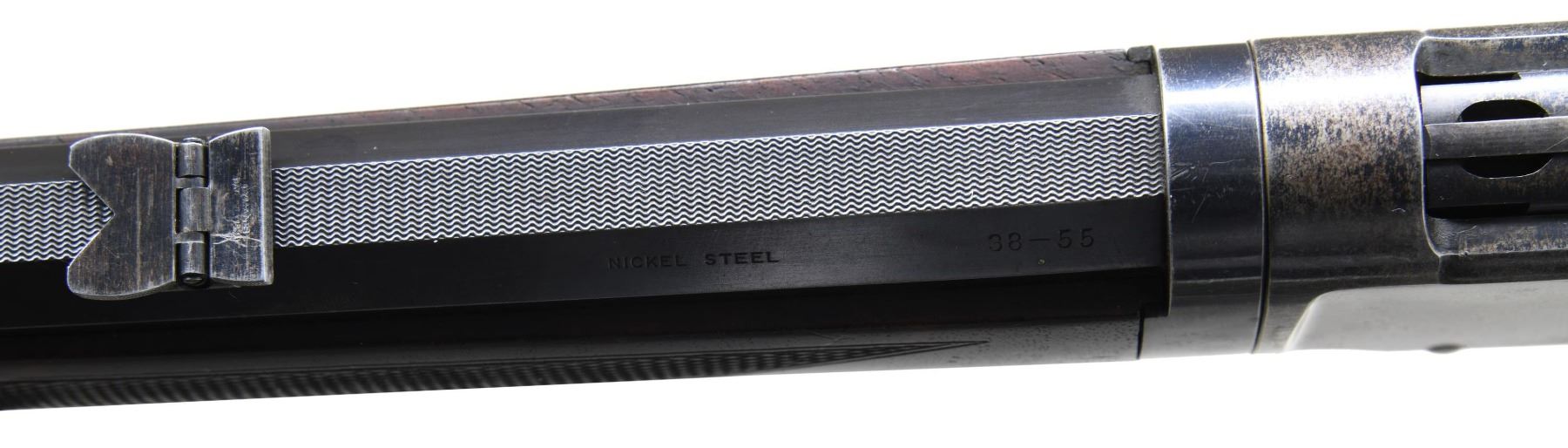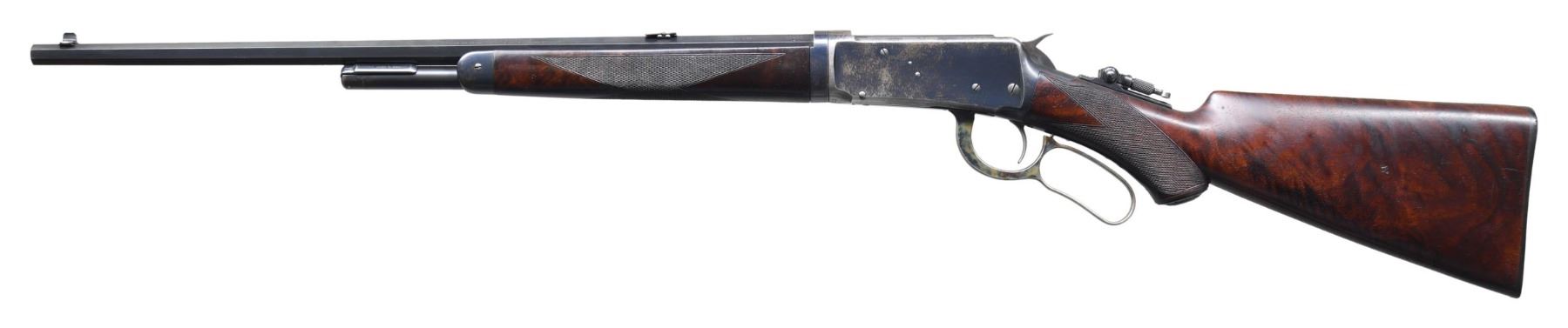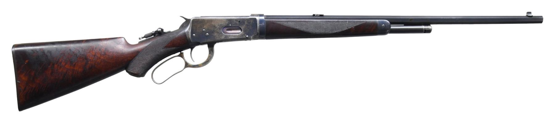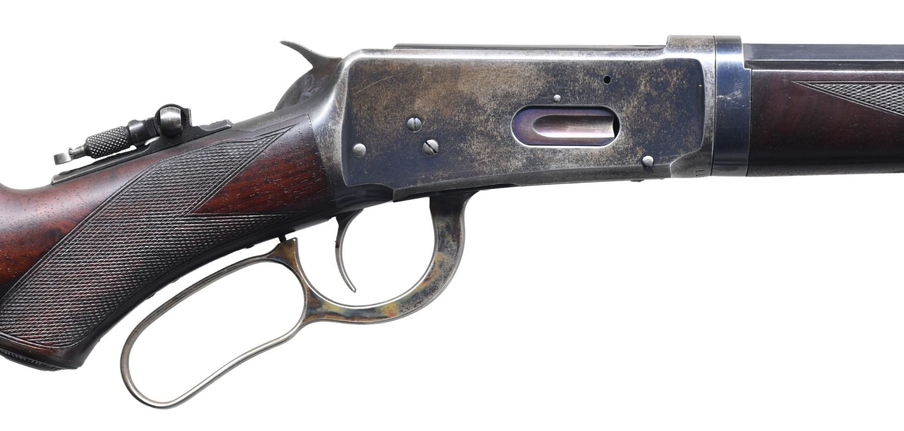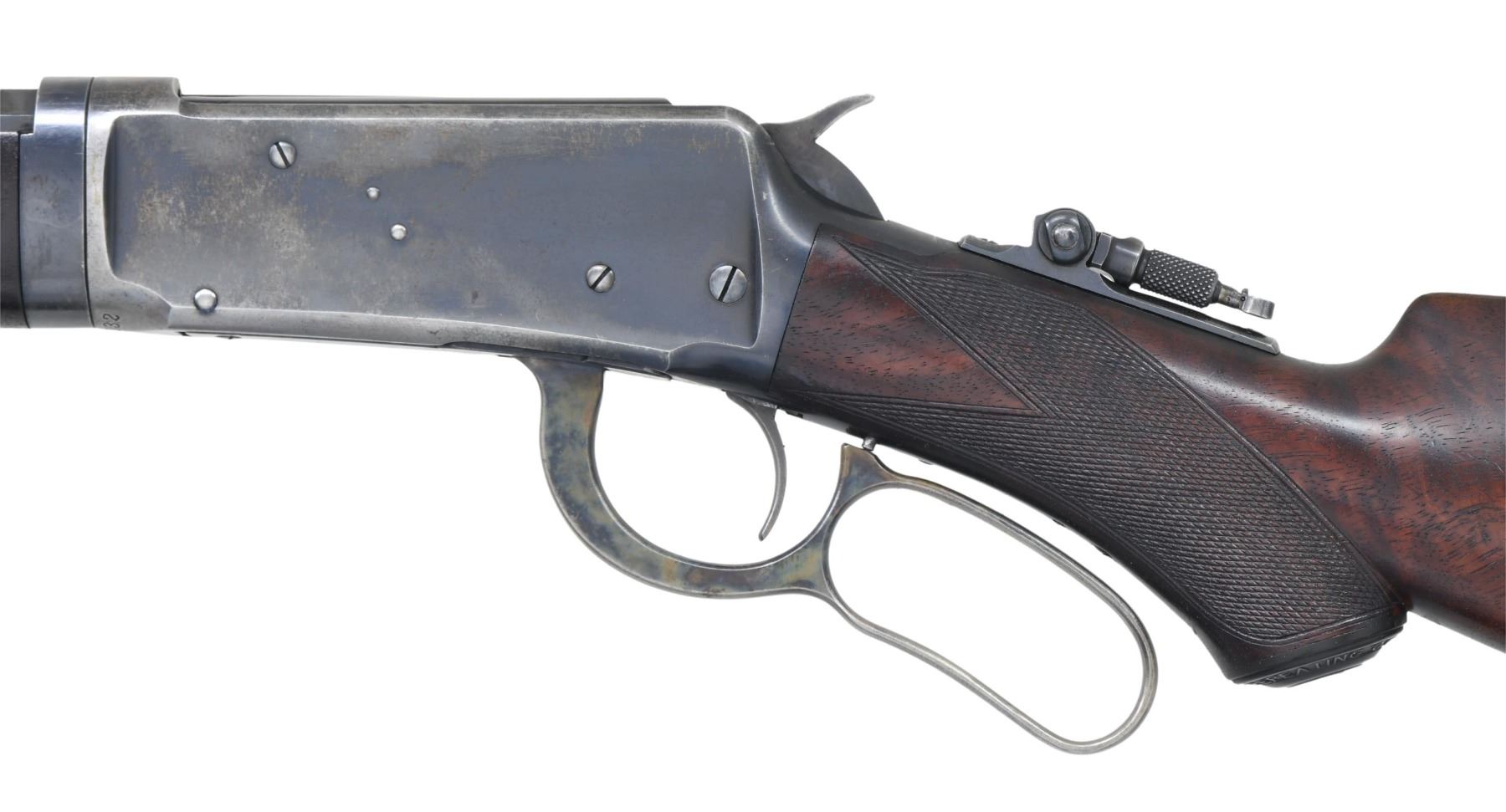 DELUXE TAKEDOWN MATTED BARREL LEVER ACTION SHORT RIFLE WITH CODY RESEARCH LETTER. Cal. 38-55. S# 116032. Bbl. 22" extra light octagon of takedown style w/ full length matted top. Half-length takedown mag. Lyman bead front sight, Lyman folding leaf rear sight & combination tang sight. Blue finish w/ case colored lever & hammer. 8 3/8" short rifle length forearm & hard rubber capped pistol grip stock of dark XXX fancy black walnut. Features include hard rubber shotgun buttplate & style H checkering. Left inside of lower tang has assembly number "12070" followed by "XXX" wood grain marking w/ additional markings "0HR". Top tang channel of stock has matching assembly number "12070". UNATTACHED ACCESSORIES: Cody Firearms Museum records check listing the following information, "Serial number applied on June 12, 1901 / Type: Rifle / Caliber: 38/55 / Barrel Type: Octagon / Barrel Length: 22 inches / Extra Light / Trigger: Plain / Checkered stock, Pistol grip / Sights: Lyman front, leaf and rear / 1/2 Magazine / Takedown / Oil Finish / Nickel steel / Matted / Rubber butt / Received in warehouse on July 08,1901 / Shipped from warehouse on August 10, 1901, Order number 93944". CONDITION: bbl. retains over 90% lightly worn finish showing slight edge wear w/ takedown marks on bottom flat. Receiver has 70% dull blue showing carry wear w/ intermittent flaking. Hammer & lever have dull lightly faded case colors. Stocks show areas of finish wear w/ scattered scratches & handling marks. Bore retains lightly worn rifling w/ scattered spots of very light pitting. PROVENANCE: Estate of Russell Dickerman. (25-2133/DS). CURIO. $7,000-10,000.