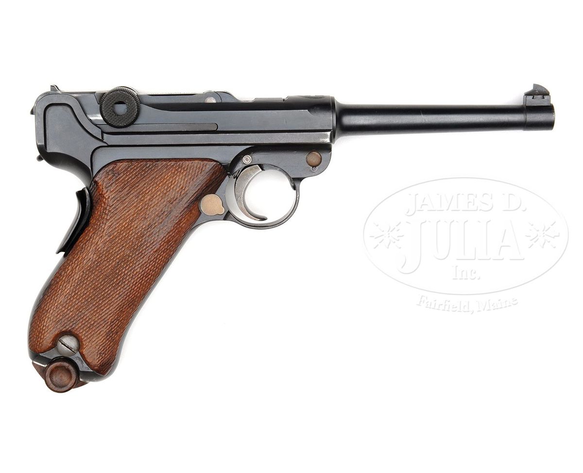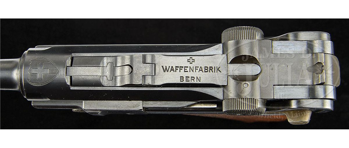 SN 26. 4-3/4" 30 Cal. bbl. DWM made frame etc. and receiver marked with Swiss cross in shield above chamber. "WAFFENFABRIK BERN" marked on center toggle link produced by the W+F. Swiss + and BP proofs. Frame is numbered internally in front of the takedown lever. All numbered parts are matching except for the grip safety which has #74. Most small parts have no numbers. Original Swiss plain wood bottom magazine. Grip safety. Checkered walnut grips. Trigger bearing in frame and sideplate and sear spring modified to improve trigger pull, which is exceptionally light and crisp, to evaluate modifications for W+F production, which commenced during WWI. This gun is featured in Dr. Geoffrey Sturgess' The Borchardt & Luger Automatic Pistols. An extremely rare Swiss variation. PROVENANCE: Collection of Dr. Geoffrey Sturgess. CONDITION: Very fine retaining 95% original blue. Straw is about 70% and appears to have been reheated in the past. Bore is bright and sharp. Grips are worn and the right grip appears to have a repaired crack in the upper right. Magazine is excellent. Mechanics are sound. 4-52839 BWS56