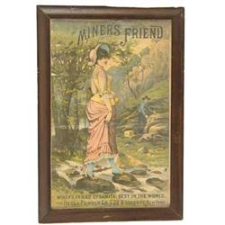 VERY RARE DYNAMITE ADVERTISING. This very attractive early paper litho was for "Miner’s Friend” Dynamite. The focal point of the picture is a lovely young maid tippy-toeing across the brook, a miner in background, preparing to plant some Miner’s Friend Dynamite who is temporarily distracted by her presence. Printed at bottom "Miner’s Friend Dynamite, the Best in the World” Hecla Powder Co., 239 Broadway, New York. Probably late 19th Century. While we have handled thousands of advertisements relating to firearms and munitions over the years, this is the first ever dynamite advertisement we have ever handled. SIZE: 9” by 14-1/4”. Image only, not including frame. CONDITION: Image has various creases, some small losses on the edge, and a few spots of staining. 4-50183