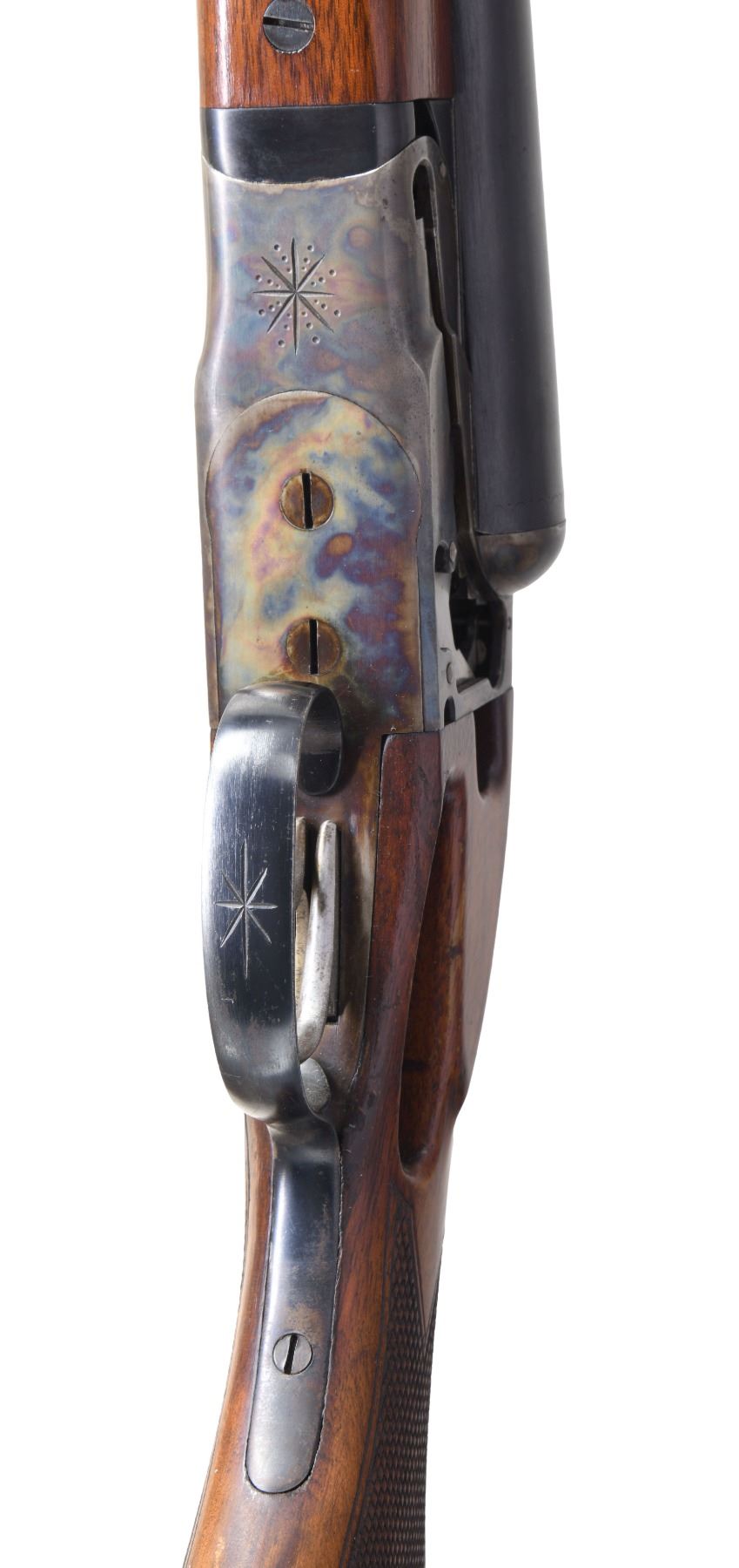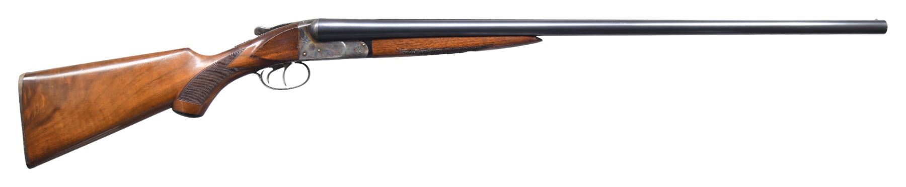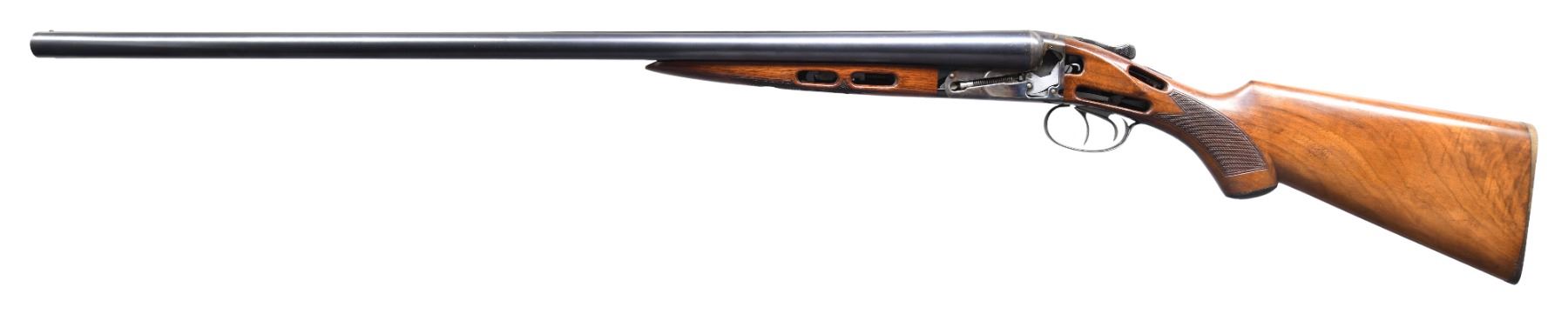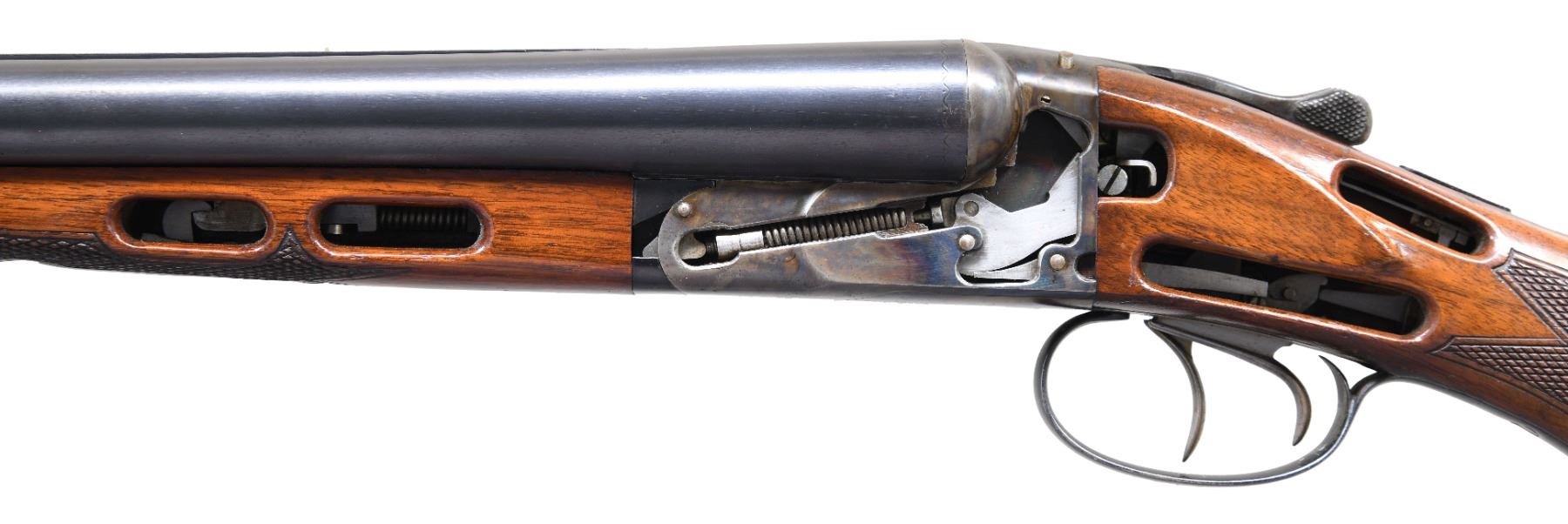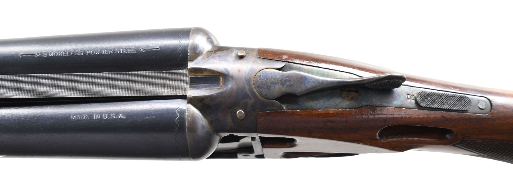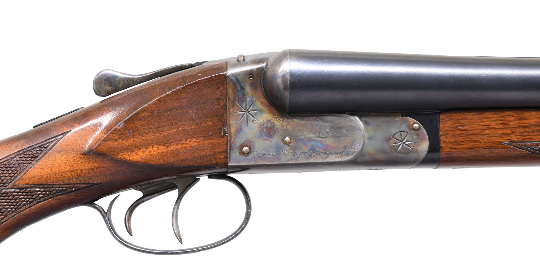 SHOTGUN. Cal. 12 Ga. 2-3/4". S# 425559. Most cut-away guns are made by a machinist without much to do on a rainy Saturday afternoon. The guns are usually well worn and the machined openings are bright. This gun was obviously made by the factory as a cut-away. Case hardening color is on sides of milled out openings and factory roll die information is not on cut-away side and gun is in unfired condition. This gun can possibly still be safely fired as barrels are not compromised. They measure 30" and are marked "SMOKELESS POWDER STEEL" "MADE IN THE U.S.A.". Barrel flats are stamped with S#, chamber length and chokes ? "4". Case hardened early (1926) NID action has cocking indicators on top and is fitted with automatic safety. Right side of action has rolled on Ithaca dog and info along with deeply cut eight pointed star. There are no traces of engraving or markings on left side of action. Matching stars are on bottom of action and trigger guard bow. Stump figured American walnut capped pistol grip buttstock has left side of action area cut away to view workings of hammers, cocking rods, safety, etc. The point pattern checkering at left side of grip has truncated points that purposely do not extend into machined openings. Matching splinter forend with Deeley release also has stock cut away on left side to view mechanism. Internal parts are nicely polished. MEASUREMENTS: BBLS: Bore Diameter: L .728. R .728. Restriction: L .037 (full). R .036 (full). Wall thickness: L .038. R .036. STOCK: DAH: 2-11/16". DAC: 1-3/8". CAST: neutral. LOP: 14-1/4". WEIGHT: 7 lb. 7 oz. CONDITION: exceptionally fine; retaining nearly all factory finishes on wood and metal. Most likely unfired. There are only a few handling and assembly marks found. Bores are bright and shiny. Mechanically fine. (25-224/MGM). CURIO. $2,500-4,500.