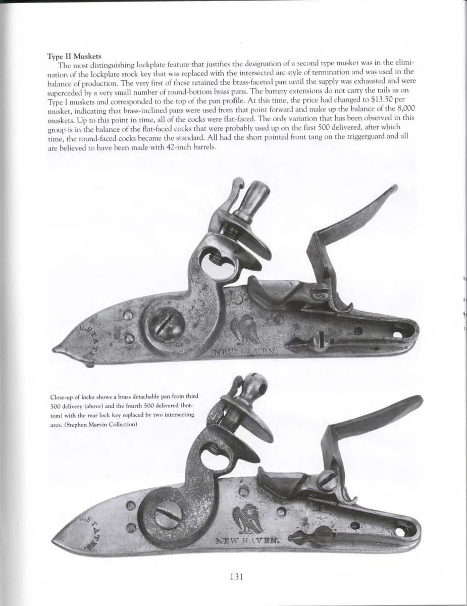 CONTRACT 1798 FLINTLOCK MUSKET. Cal 69. NSN. Bbl. 45". The earliest of Whitney musket contracts were delivered & 1801-1802, 500 each year. This wonderful unaltered survivor conforms to specifications from Moller & Schmidt excellent texts w/ minor variation in markings. Based on examples shown in these 2 texts, these are very rare guns to find in original flint configuration. 100% Original & as found w/ exception of contemporary smaller headed lock screw. This example was not disassembled to look for additional proofs & assembly marks. 59.5" Overall. 45" Bbl. has lg. “P” & “W” stamped at breech on top. The “W” is possibly “M” stamp from opposite side, as there is “MARYLAND” brand on right side of forestock. Maryland purchased several thousand muskets from federal stockpile 1809-1812 as cited in Moller. Lock w/ integral faceted iron pan is marked w/ eagle above “NEW HAVEN”, & “U. STATES” in arc at tail. “2” Stamped rear of trigger guard in stock, sm. carved initials opposite lock. CONDITION: Very good- fine overall. All original & complete. Metal has a mostly smooth dark iron patina w/ pitting at breech & buttplate. Markings in metal & wood well defined & discernible. Bbl. is thin at muzzle from heavy use. Stock is sound & well fit w/ old chipping around lock all patinaed over. Hand worn patina overall. "mm" at buttplate. Original ramrod is 44.5" long. Mechanically fine w/ smooth clear bore. PROVENANCE: The Estate Collection of Gary Parietti. (01-19289/JS). ANTIQUE. $2,000-3,000.