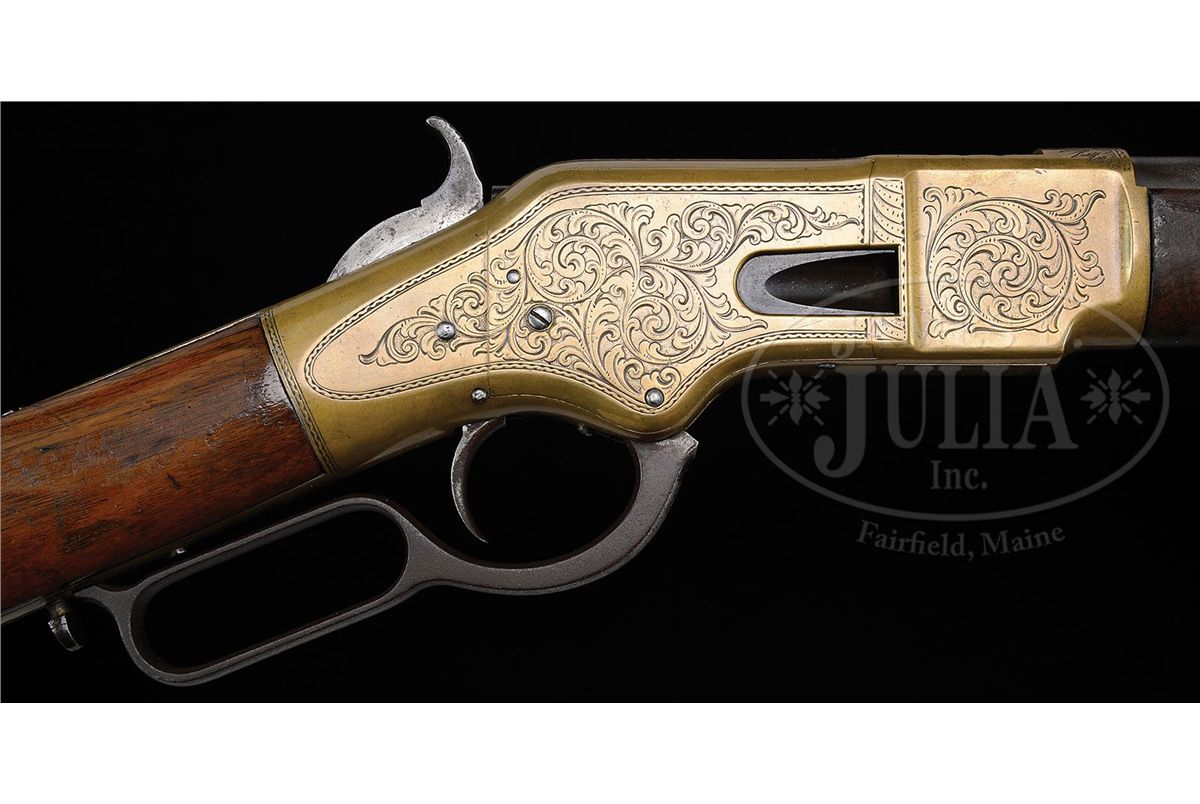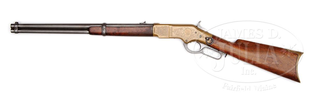 SN 105316. Cal. 44 RF Henry. Usual configuration with 20" bbl, full magazine & integral front band/front sight with 2-position flip rear sight. Left side of receiver has a staple & ring. Mounted with very nicely figured, uncheckered, slab-sawed American walnut with straight stock & crescent brass buttplate. Buttstock is probably an old replacement. Receiver is very nicely engraved by L.D. Nimschke in his typical bold flowing foliate arabesque patterns with extremely fine pearled or punch-dot background. Left sideplate has the oval vignette with the inscription in script "Don / Pio Pico / RANCHO / SANTA / MARGARITA / 1873". Right side is elaborately engraved with flowing intertwined foliate arabesque patterns with both sides having dbl chip borders which also extend around the rear edge and top tang. Top of the receiver is matching engraved with a wonderful sunburst pattern over the receiver ring. Quite unusually the bbl bands are matching engraved as is the buttplate tang. Bottom of the carrier is engraved in diamond & dot patterns. Left side of lower tang, under the wood, is marked with a "V" and "XXX". Both sides of the tangs & interior of the receiver retain strong silver plating as does inside the buttplate. Top tang channel of the buttstock is marked with the matching SN which may be spurious as it appears the buttstock is a replacement because the wood in the buttstock is not 3X quality and the finish is a different color, which does not match the quality of the forearm which does appear to be 2-3X quality. The matching number is also found inside the toe of the buttplate and unusually, the "5" in the SN is stamped upside down. Pio Pico was a very famous, if controversial, resident of Southern California and the last governor of Mexican California (1845-46), before Mexico lost the war with the United States and California became an American possession in 1846. Mr. Pico was born Pio de Jesus Pico, IV on May 5, 1801 at the Mission San Gabriel, California. In 1810 the Pico Family moved to San Diego where Pio grew up. In 1820 Pio opened a small store in San Diego to support his family. In about 1826 he became active in local politics and in about 1828 apparently became a sort of revolutionary. In 1829 he was granted a rancho, which was confirmed in 1831. After a rebellion and defeat of Gov. Victoria in 1831, Pio was declared Governor for a period of a few months. In 1834 he married and in the same year took charge of the Mission San Luis Rey and remained in charge until 1840. In 1837 he led an unsuccessful revolt against the then Governor Alvarado and in 1838 finished third in a contest for Governor. In 1841 he and his brother Andres obtained a grant for the Rancho San Onofre y Santa Margarita which was 89,742 acres. In 1844 he and Andres obtained the Las Flores Rancho bringing their total acreage to 133,440 acres and renamed the property Santa Margarita y Las Flores. This property later became, and still remains, Camp Pendleton. Also in 1844 the struggle between Northern & Southern California continued and Pio Pico led the opposition to Governor Micheltorena and on Feb. 15, 1845 Pio Pico was declared the legal Governor of California which was confirmed on Sept. 3, 1845 by the Mexican President Jose Herrera, which title he held until California surrendered to the Americans on July 4, 1846. Pio Pico fled to Mexico to avoid surrendering to Gen. Fremont and did not return until 1848 after the armistice was signed. He was able to reclaim his property and additionally purchased Rancho Paso de Bartolo Viejo, 8,891 acres for $4,642.00. The brothers became immensely wealthy supplying beef to the Northern California gold fields along with other ranching interests. In 1853 Pio Pico became a Los Angeles City Councilman around which time the Board of Land Commissioners met to review the Mexican land grants. The brothers were immensely successful and wound up with a total of 532,000 acres making them some of the richest men in California. Over the ensuing years Pio Pico continued ranching, became a stock holder in the Los Angeles Petroleum Refining Co. which later became Standard Oil of California. During this time he also built the Pico House in 1870, a luxury 3-story brick hotel in Los Angeles which cost $50,000 to build and $35,000 to furnish. His fortunes began to decline and he eventually lost all of his properties and died Sept. 11, 1894. Numerous buildings, streets, towns and other entities are named for this unusual man who rose from abject poverty, uneducated, to become a famous & wealthy person. His Pio Pico mansion still stands today and is a state park. Accompanied by three small pamphlets about the man and Pio Pico Mansion. Also accompanied by four small hardbound and one paperback books regarding Pio Pico and his life & accomplishments. Additionally accompanied by copies of four photographs of Pio Pico, one of which includes his wife and two young women. Also accompanied by a 3-page letter from noted Winchester historian & author, George Madis, who details most of the information about this carbine as above. PROVENANCE: Barnes Family Collection. CONDITION: Very good. Bbl, magazine tube, bbl bands, lever & hammer are a cleaned silver/brown patina; magazine tube has a ding on the muzzle end; receiver & sideplates show moderate edge wear with some light wear to the engraving and overall retain a medium mustard patina; buttplate is a matching condition & patina. Stock has a cracked toe with several gouges on the bottom along with other nicks, scratches & dings and a repair to the right side of the comb and overall retains about 80% orig varnish with a halo from the saddle ring; the orig forearm has a gouge on the right side, otherwise is sound and retains 60-70% orig varnish. Hammer will not catch at full cock, otherwise mechanics are fine, bright shiny bore. 4-47652 JR215