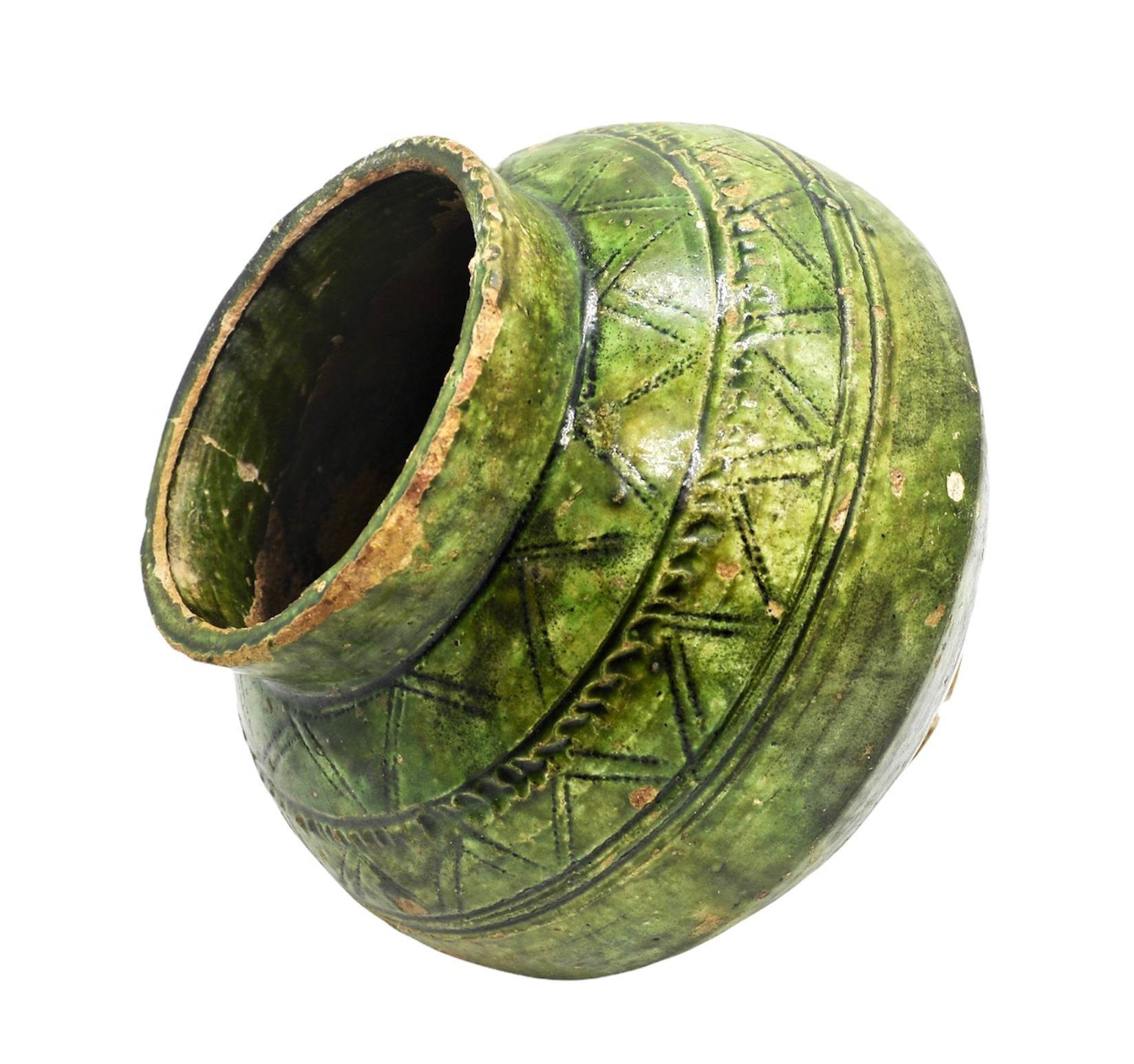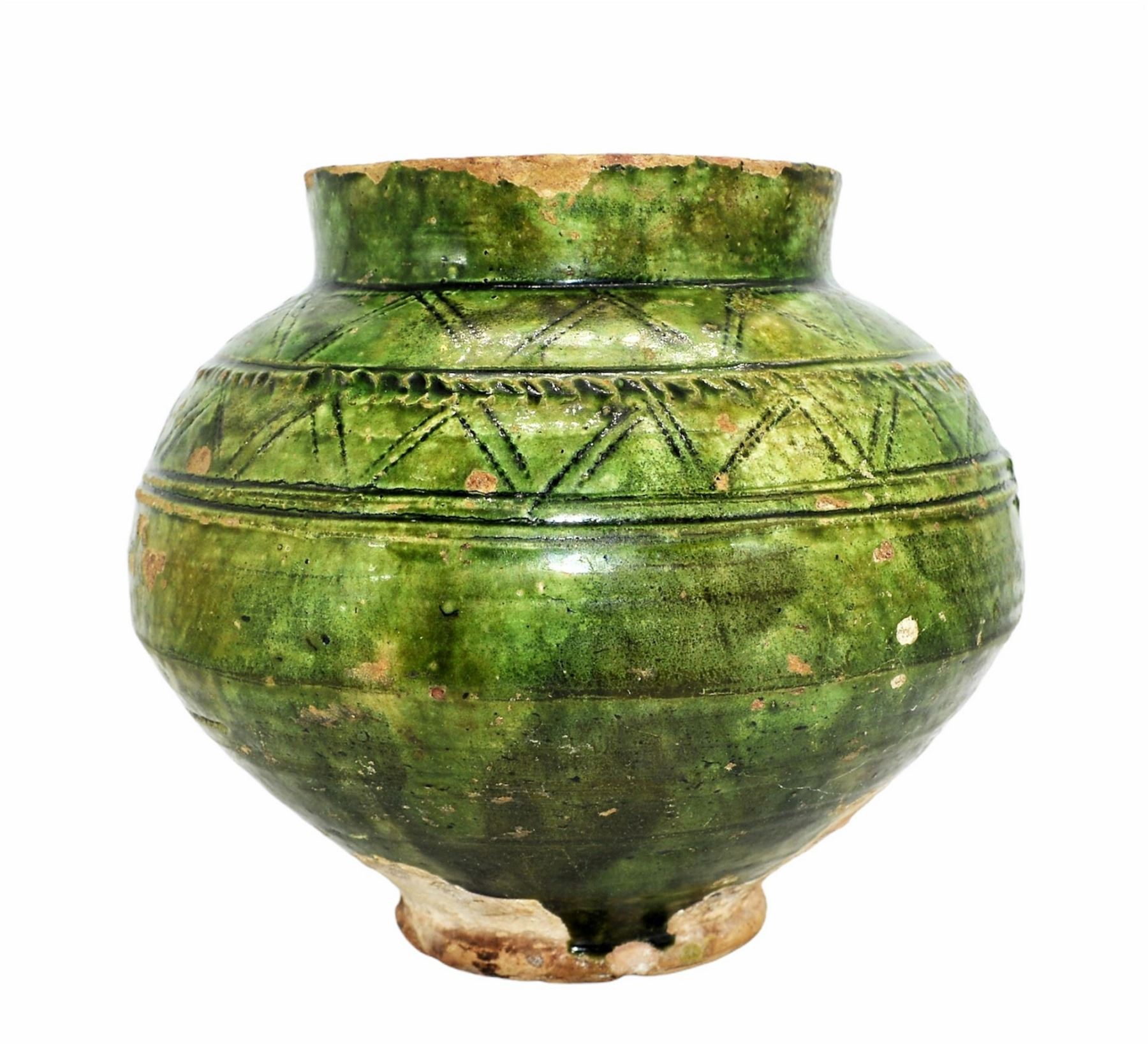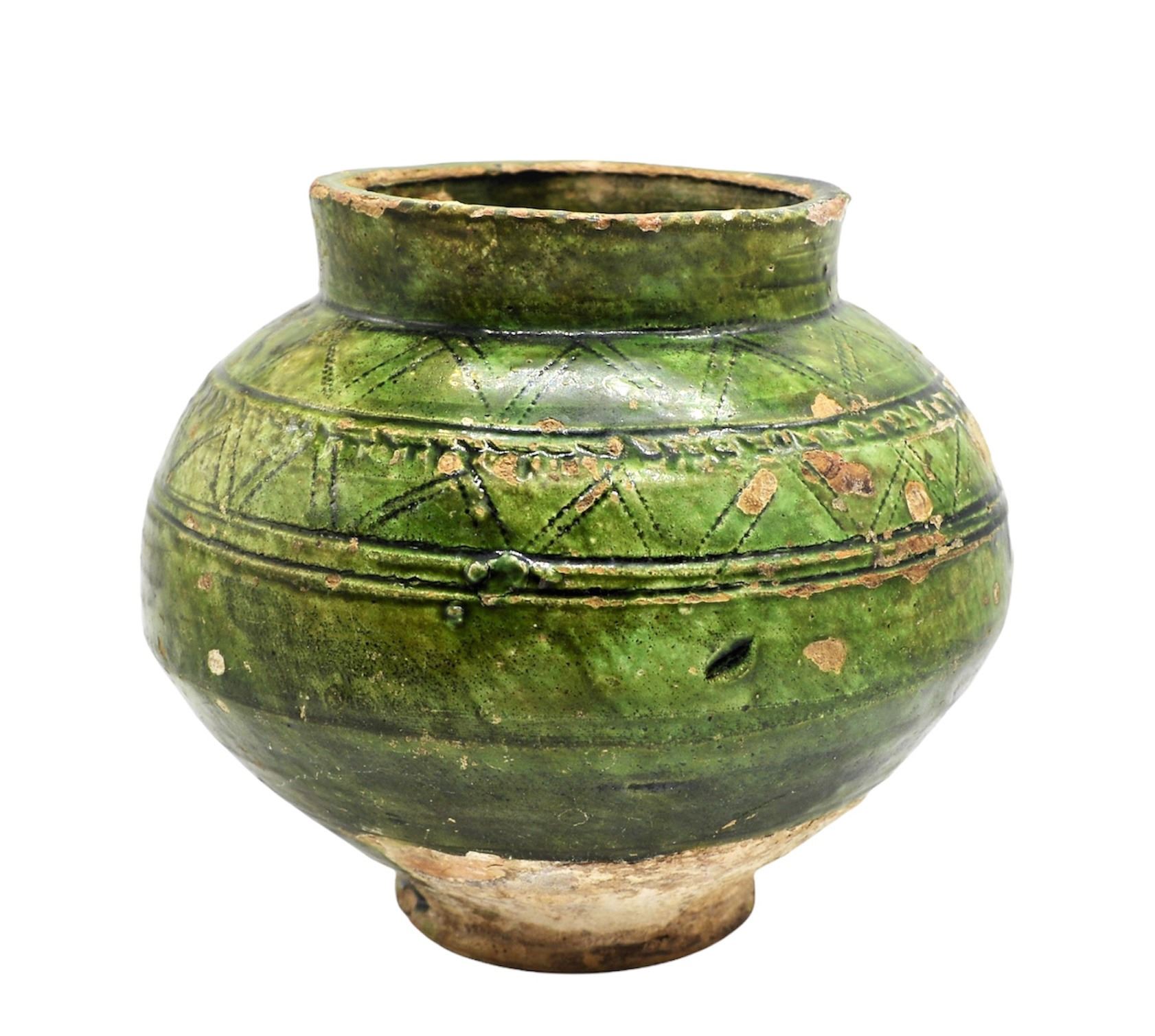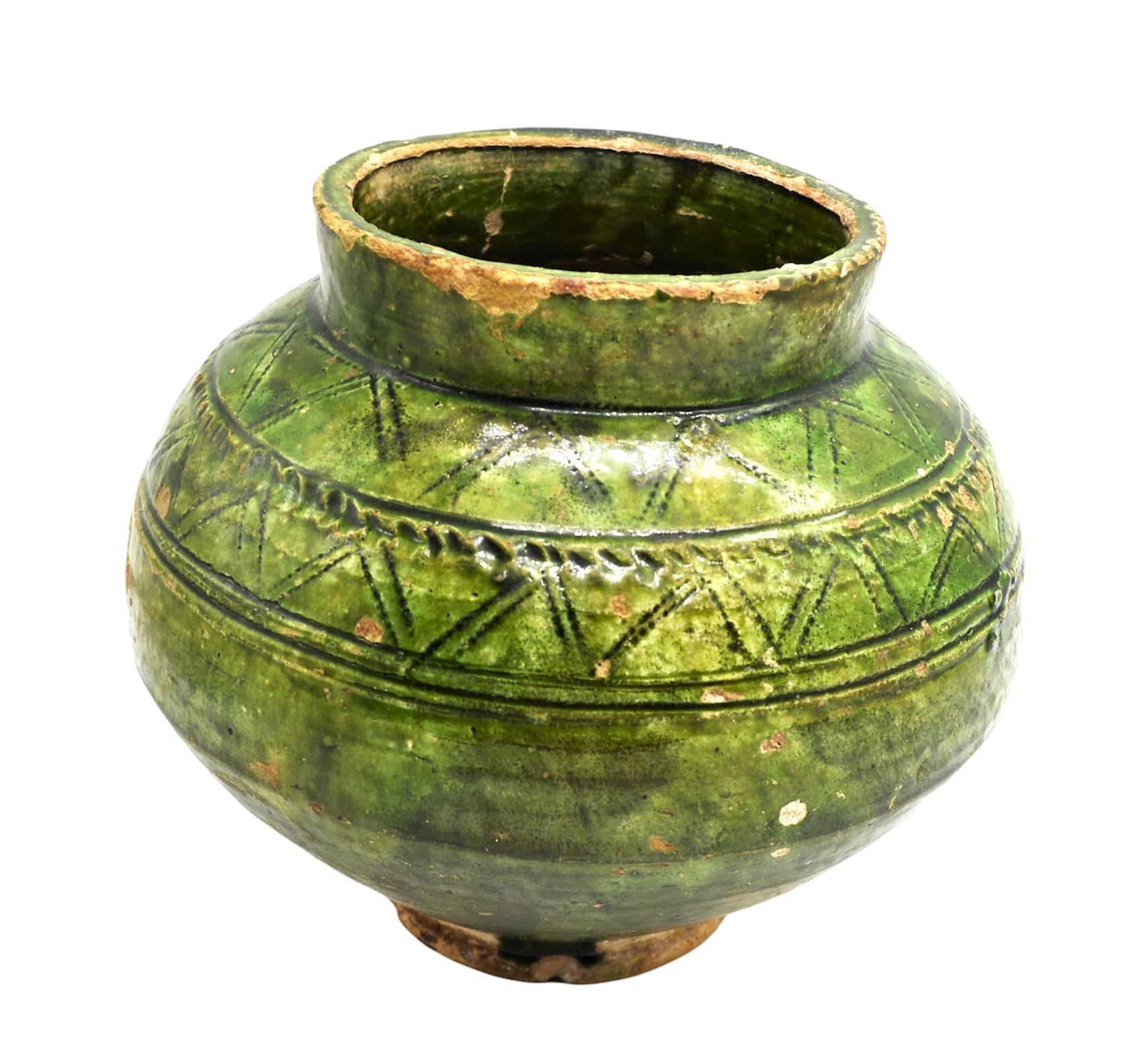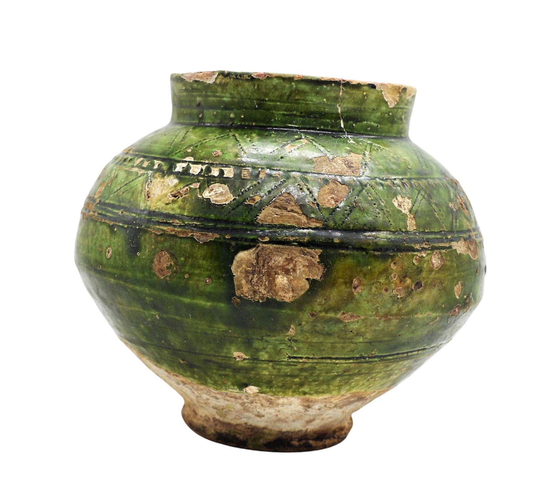 A VERY RARE & INTACT ANCIENT ISLAMIC FATIMID GREEN-GLAZED JAR, CIRCA 10TH-11TH CENTURY, Of baluster form on short foot, one incised with a geometric band around the shoulder. For a very Similar & Larger Example