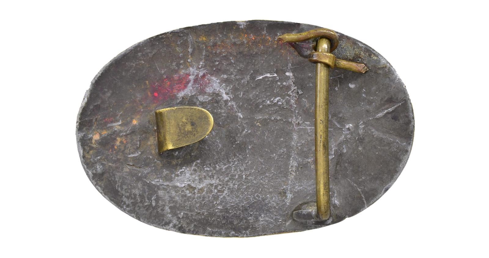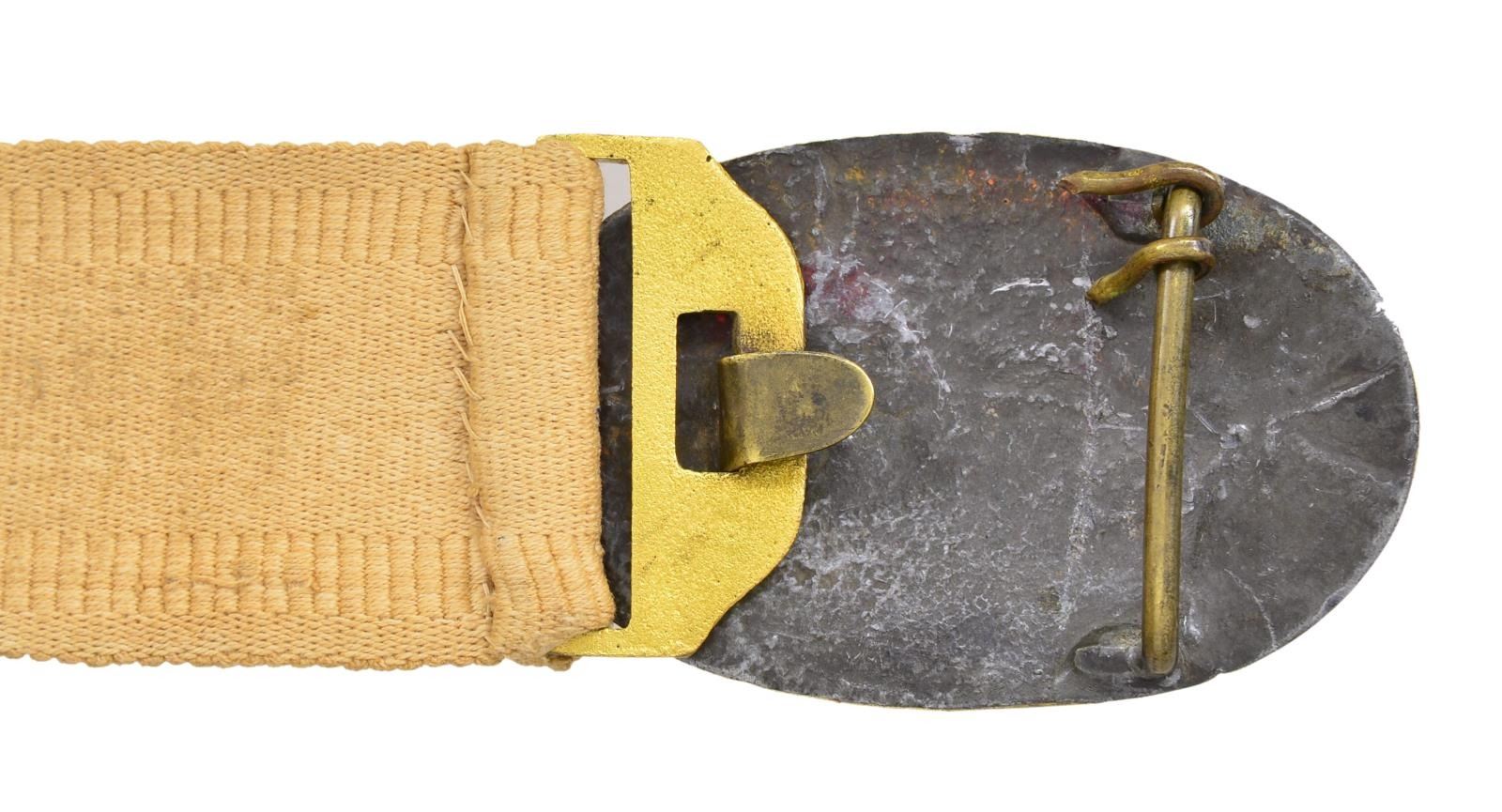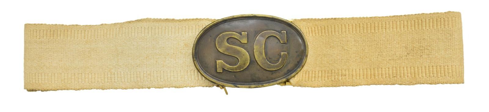 BELT. 7.5 x 56.5mm, solder filled. This is rare variant made w/ bar & hook back, 40” canvas belt w/ sewn 51mm wide cast brass keeper. These plates dug-up are much more common than non-excavated examples. Large size SC ovals are rare & this has beautiful patina which would be difficult to improve on. CONDITION: very good to fine overall, small bend, soiled canvas. PROVENANCE: Ex-Steve Mullinax Collection.(02-17227/JS). $6,000-8,000.