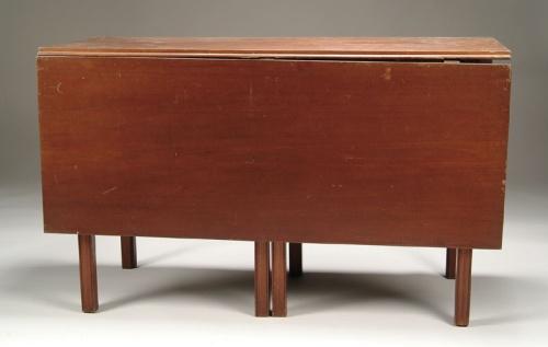 VERY RARE PERIOD CHIPPENDALE MOLDED LEG, 8-LEG DROP LEAF TABLE. Solid mahogany with deep straight leaves having four fixed molded legs and four swing-out molded legs. SIZE: 49in. l x 21in. w (closed)/58in. w (open). CONDITION: Some dings and scratches, also a small crack; generally very good. This is a very rare form and excellent size. 8-87195