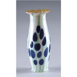 Lot 203 VERY RARE QUEZAL GRAPE SHADE This wonderful Quezal shade has purple grapes and green vertical lines against an opal background. Ruffled lip has gold iridescence on inside, remainder of shade interior is creamy yellow. Signed inside fitter “Quezal”. According to Mr. Heiden’s notes there were only six of these shades produced. SIZE: 7-1/8” t x 2-3/4” dia. CONDITION: Very good to excellent. 5-70449