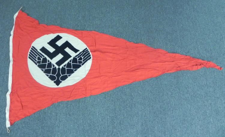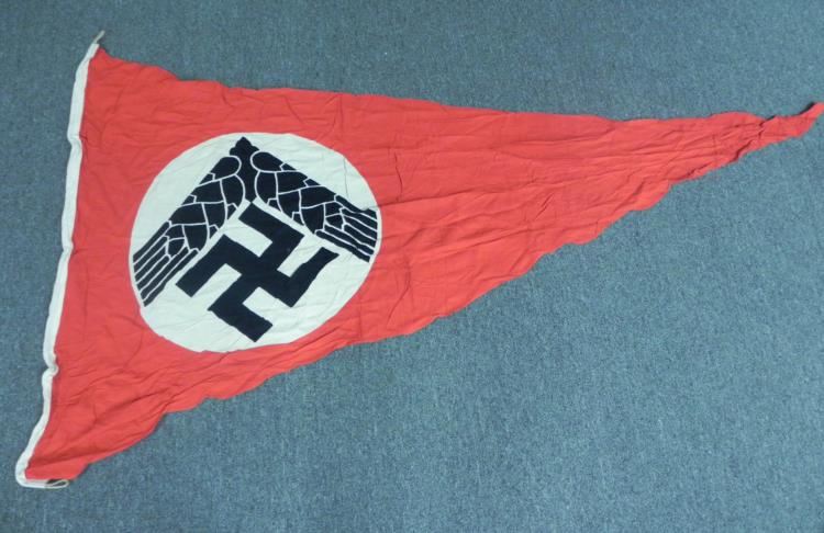 VERY RARE RAD/REICHSARBEITSDIENST TRIANGULAR HQ BANNER-48X82" ONE GREAT OFFERING IS THIS VERY RARE RAD WOMENS HEADQUARTER'S TRIANGULAR BANNER--DOUBLE SIDED- HAS A LARGE SWASTIKA AND WHEAT SHAFTS ON EACH SIDE--BUNTING HAS THICK LOOPED HANGING ROPE THRU IT AND OUT EACH SIDE--48" WIDE AT BUNTING AND 82" IN LENGTH-A PRIZE OFFERING.