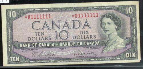 VERY RARE REPLACEMENT "SOLID NUMBERED" NOTE! UNIQUE? One digit "SOLID" numbered RADAR note "*B/D1111111" $10 1954 BC-40bA VF. The note could be "UNIQUE" as there is only a possibility of two notes with solid numbers for this series. Worth a premiu