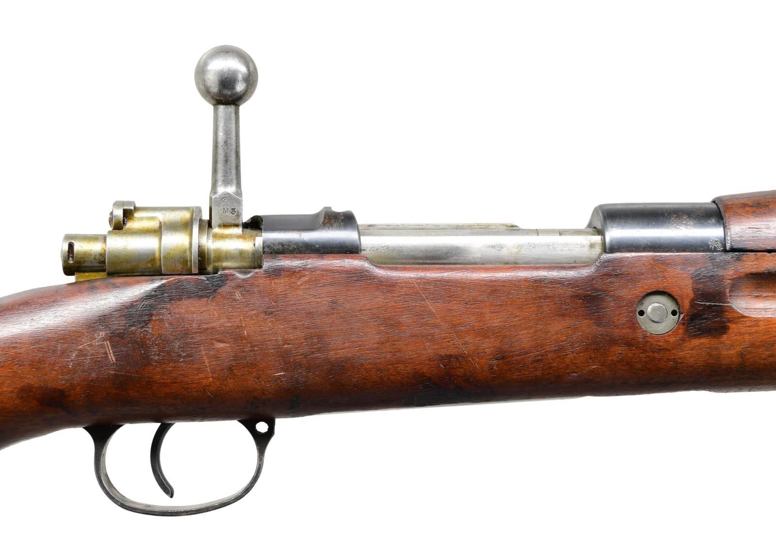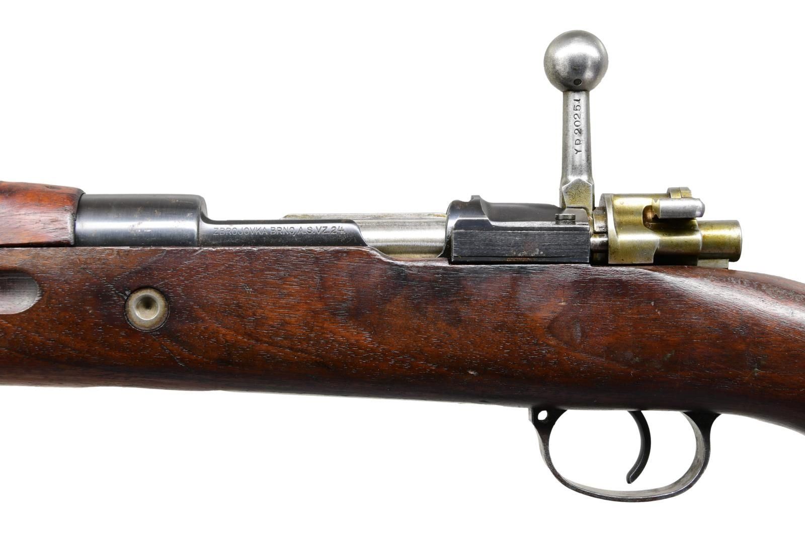 Cal. 8x57 (8mm Mauser). S# NSN. Bbl. 23 1/4". Blade front sight. Tangent rear sight graduated to 2000m. Right side of receiver has Slovak Republic acceptance stamp. Receiver top is blank. Left side rail of receiver is marked "ZBROJOVKA BRNO,A.S.VZ24.". Bolt is numbered "YD20251" & has a standard Brno acceptance stamp on top of ball. Other visible parts are unnumbered. These rare VZ24 rifles were assembled by the WW2 German client state of the Slovak Republic. Surviving small arms from the Slovak republic are extremely rare & they are some of the hardest to find WW2 small arms today. Blued finish. Walnut stock set w/ both left side & bottom mounted sling swivels. Proper cleaning rod present. CONDITION: stock set shows a couple gouges, a crack on handguard top running between both bands, some black staining, scattered dings & handling wear. Metal retains 70% original blue w/ some light pitting spots on receiver, a couple scratches, scattered spotty oxidation & fading. Bright near excellent bore. PROVENANCE: Collection of Dr. Fred Novy, ASAC. (24-1840/MJC). CURIO. $3,000-5,000.
