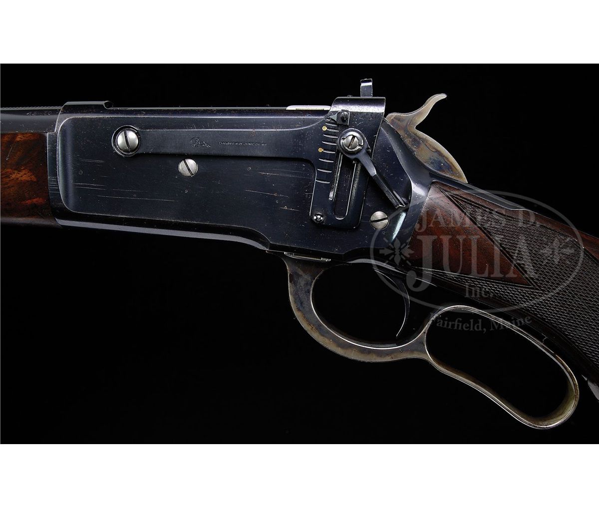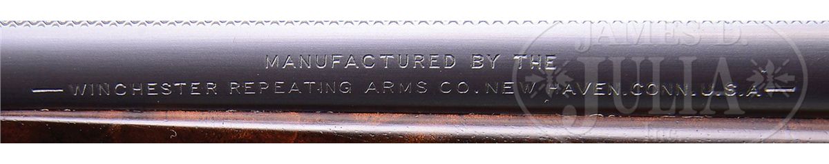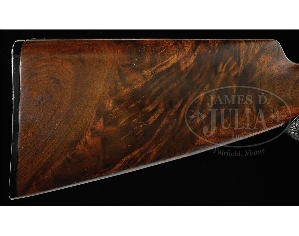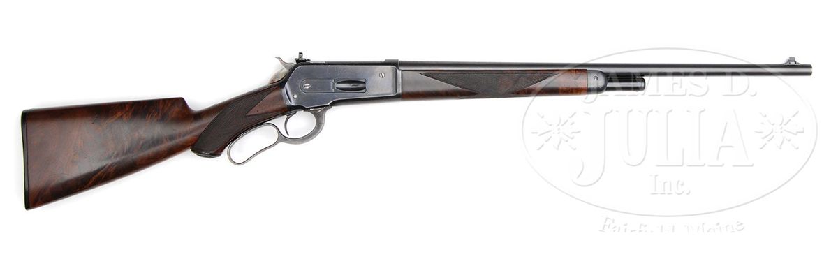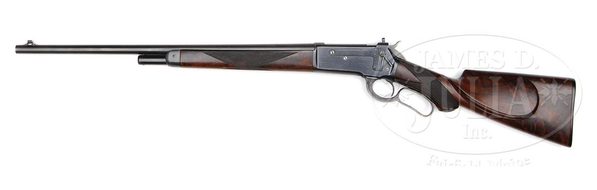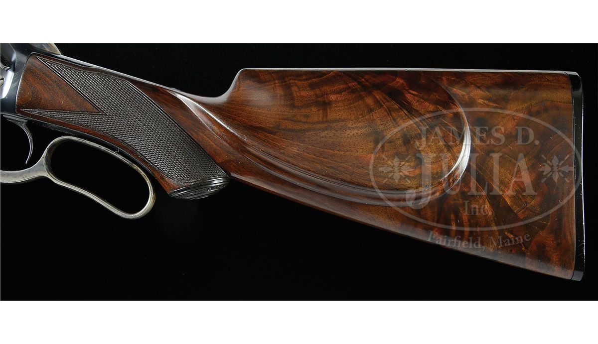 SN 126469. Cal. 45-70. Very rare special order rifle with 22" full matted nickel steel rnd bbl, 5-shot magazine with pedestal mounted Lyman ivory bead Jack front sight, no provision for a rear sight seat and a Lyman #21 receiver sight. Left side of lower tang, under the wood, is marked with assembly number "432", "R" and "XXX". Matching assembly number is found in top tang channel of buttstock. Mounted with very highly figured, center crotch, flame grain American walnut with H-style checkered forearm and capped pistol grip stock that has a very rare cheekpiece and Winchester hard rubber buttplate. This rifle, identified by SN, appears on p. 307 of The Winchester Book, Madis. Accompanied by a Cody Firearms Museum letter which identifies this rifle, as found, with oil finished wood and extra light, received in warehouse Sept. 30, 1902 and shipped same day to Order #156659. Also accompanied by a copy of the Winchester shipping record for this rifle. Also accompanied by an NRA silver medal "TEN BEST WEAPONS AWARD 1986" number "257". Along with the medal is an NRA certificate of Recognition identifying this rifle by SN with the owner listed as J.E. Habol at the 115th Annual Meeting on April 27, 1986 in New Orleans. PROVENANCE: Wes Adams Estate Collection; J.E. Habol. CONDITION: Very fine. Bbl & magazine tube retain 95-96% strong orig blue with slight muzzle edge wear and some minor thinning; forend cap retains about 95% orig blue; receiver retains 95-96% strong orig blue with sharp edge wear, a few scattered freckles of pin prick rust and some minor candy striping; lever & hammer retain strong bright case colors on the sides, moderately faded on outer faces of lever. Wood is sound with light handling & storage marks and retains most of a very fine, professionally restored oil finish. Mechanics are crisp, brilliant shiny bore. 4-44464 JR26