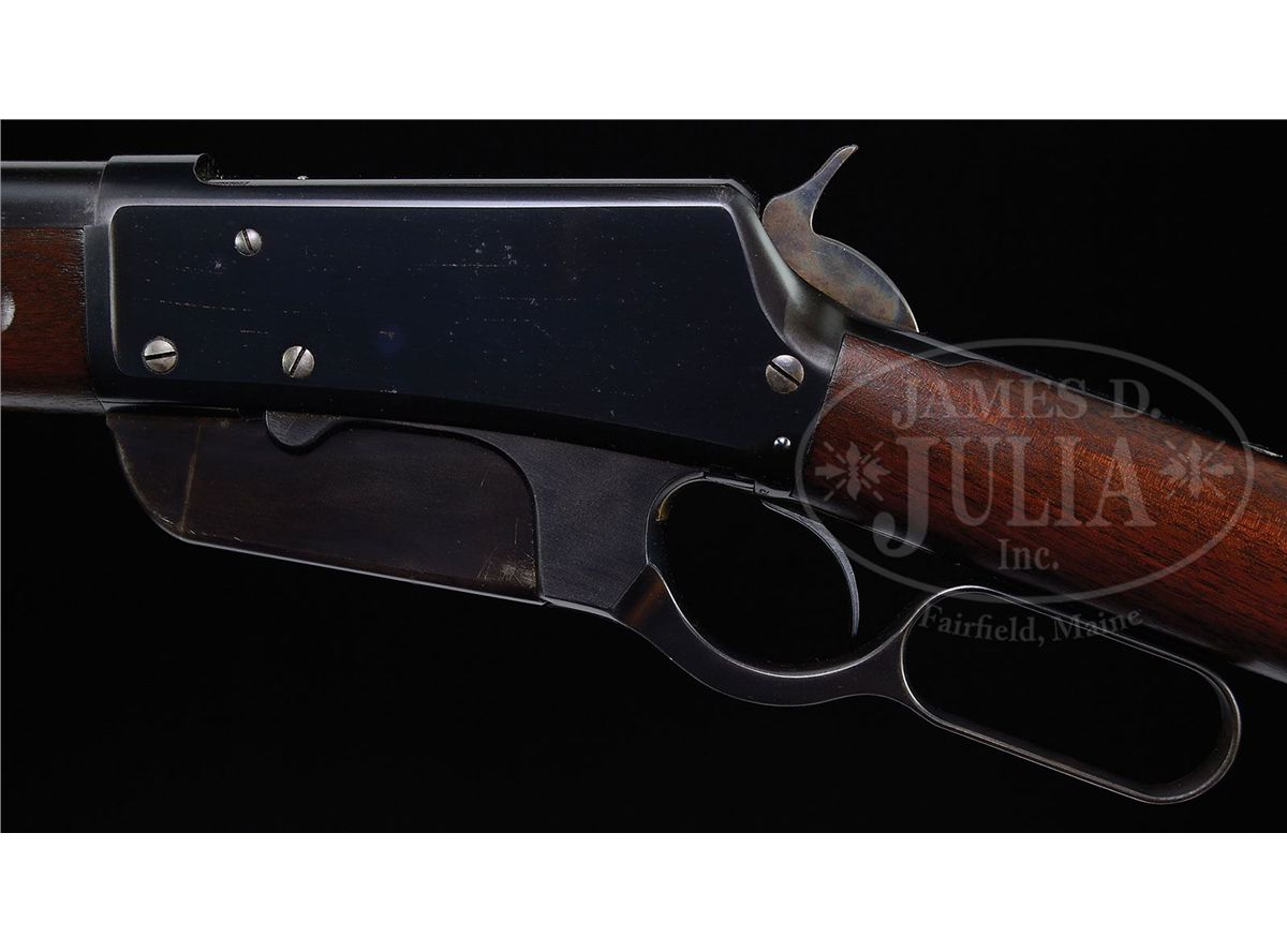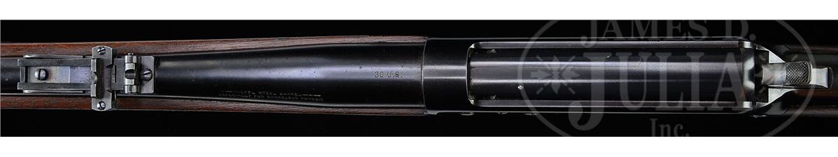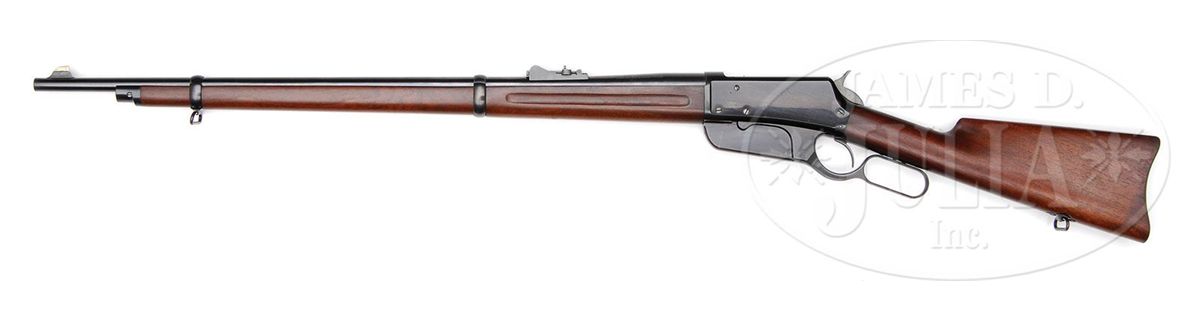 SN 1481. Cal. 30 US (30-40 Krag). Standard grade musket with 28" tapered rnd bbl, pedestal mounted German silver front sight and ski jump musket rear sight that is completely unmarked. Bbl has standard markings including "NICKEL STEEL BARREL / ESPECIALLY FOR SMOKELESS POWDER" and has caliber marking over the chamber. Lever is solid first type. Mounted with uncheckered, straight grain American walnut, nicely figured with full length forearm that has grasping grooves and two bbl bands with straight stock & crescent buttplate with trap containing a cord & brass pull-through cleaning jag & brush. Upper band & buttstock have musket swivels. Accompanied by a Cody Firearms Museum letter which identifies this musket in caliber 30, received in warehouse Oct. 22, 1896 and shipped four days later. Returned & repaired Jan. 30, 1907. Flatside muskets are the most rare and almost never encountered with orig finish. PROVENANCE: Eldon Owens Collection, Barnes Family Collection. CONDITION: Extremely fine plus. Bbl, bbl bands & forend cap retain virtually all of their crisp, bright orig blue showing little or no wear; receiver, magazine box, lever & buttplate also retain virtually all of their orig factory blue with some light candy striping and a few scratches on the receiver with faint sharp edge wear; hammer & trigger link retain virtually all of their brilliant orig case colors. Wood is sound with no visible flaws and retains virtually all of its orig factory finish. Mechanics are crisp, brilliant shiny bore, appears to be new & unfired. 4-47626