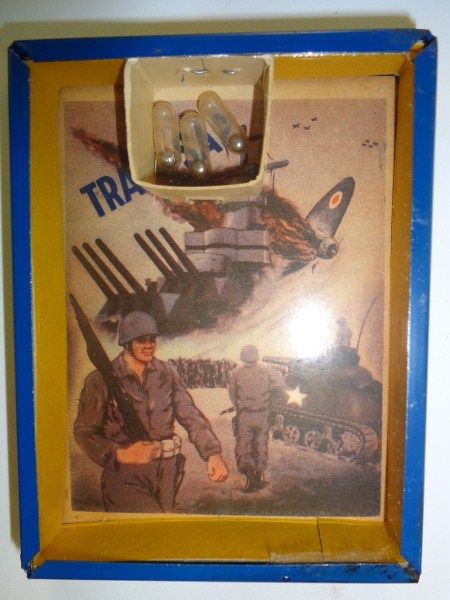 Made by the A.C. Gilbert Company in New Haven, Conn., U.S.A. Shows Soldiers shooting enemy aircraft out of the sky. Has picture of tank, battleship and plane.