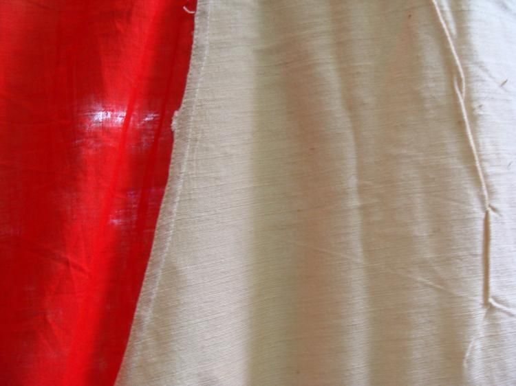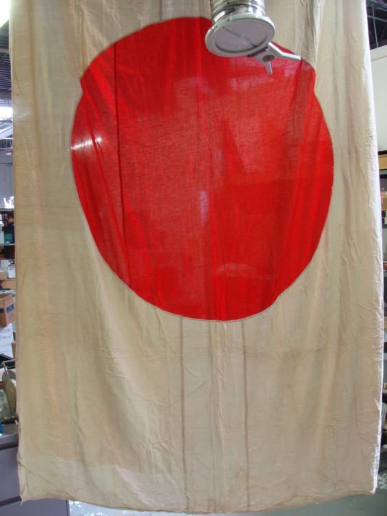 VERY RARE WWII JAPANESE NATIONAL BANNER/FLAG--6'X10'-ORIGINAL CAPTURED FROM JAPANESE NATIONAL HEADQUARTERS * OUTSTANDING, VERY RARE WWII NATIONAL POLITICAL HEADQUARTERS JAPANESE NATIONAL BANNER FLAG BROUGHT BACK BY U.S. MARINE OFFICER FROM THE PACIFIC THEATRE-THE FLAG IS QUITE LARGE AT 6FT X 10FT. MADE FROM A MULTI-PIECE WOVEN COTTON/SILK BLEND--THE TOP HAS THREE LEATHER REINFORCED GROMMETS WITH HEAVY TIE ROPES ATTACHED--SHOWS COLOR AGEING AND A COUPLE OF SMALL STAINS, BUT OTHERWISE IN REMARKABLY GOOD CONDITION--A GREAT DISPLAY PIECE FOR YOUR COLLECTION DISPLAY. *