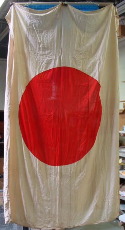 VERY RARE WWII JAPANESE NATIONAL BANNER/FLAG--6'X10'-ORIGINAL CAPTURED FROM JAPANESE NATIONAL HEADQUARTERS * OUTSTANDING, VERY RARE WWII NATIONAL POLITICAL HEADQUARTERS JAPANESE NATIONAL BANNER FLAG BROUGHT BACK BY U.S. MARINE OFFICER FROM THE PACIFIC THEATRE-THE FLAG IS QUITE LARGE AT 6FT X 10FT. MADE FROM A MULTI-PIECE WOVEN COTTON/SILK BLEND--THE TOP HAS THREE LEATHER REINFORCED GROMMETS WITH HEAVY TIE ROPES ATTACHED--SHOWS COLOR AGEING AND A COUPLE OF SMALL STAINS, BUT OTHERWISE IN REMARKABLY GOOD CONDITION--A GREAT DISPLAY PIECE FOR YOUR COLLECTION DISPLAY. *