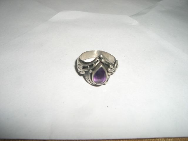 VERY UNIQUE DESIGN SILVER RING WITH LARGE AMETHYST-TEAR DROP CUT CENTER STONE!! RING IS NOT STAMPED. SILVER RING CAME OUT OF SAFE BOX!! ***Coin, Currency & All Items Listed in this auction - Grades, Conditions and Values are not Safe Deposit Coins LLC Responsibilty. Grades, Condition and Values are determined by Consigner(s) & Buyers ONLY