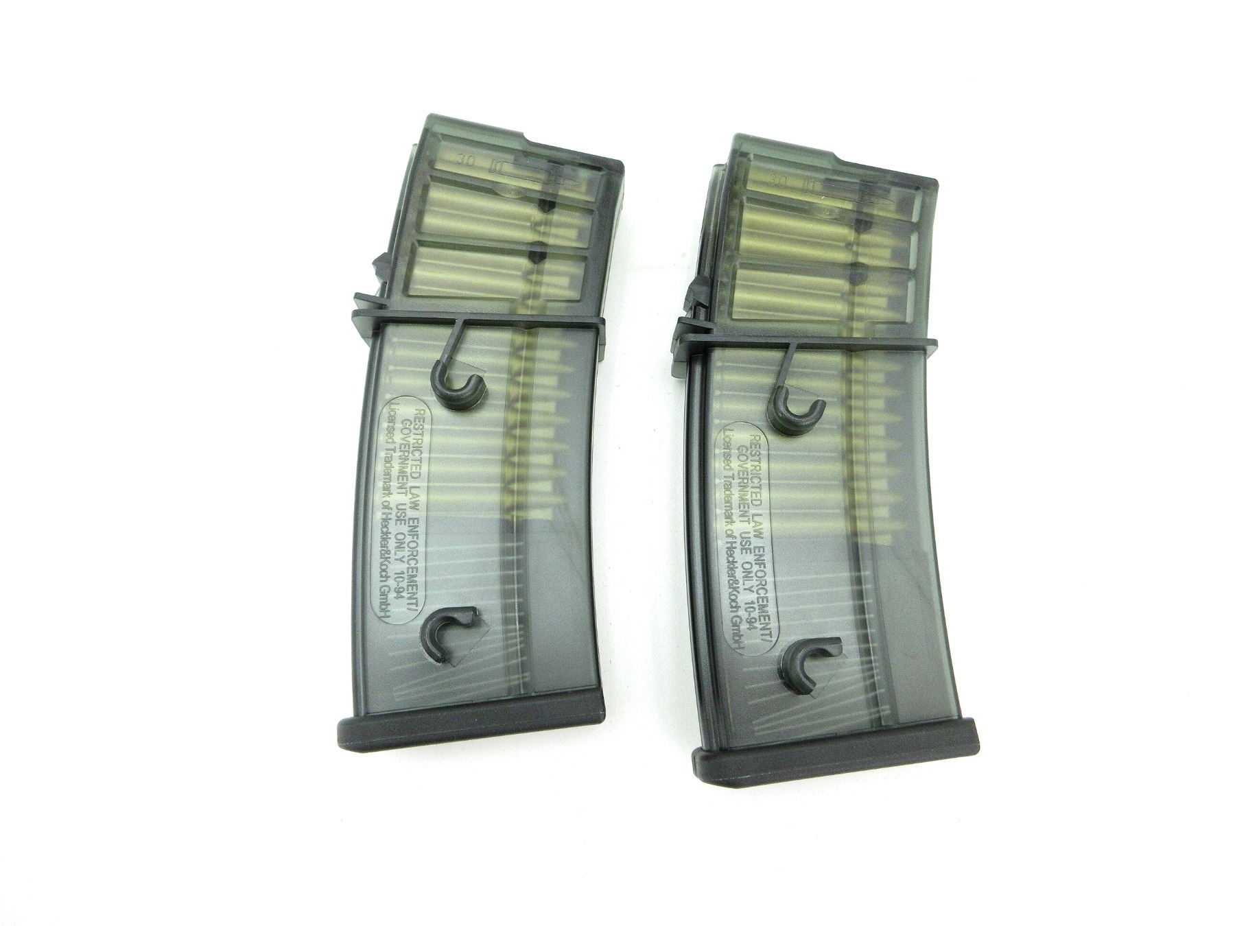 LOT INCLUDES; (2) 6MM PLASTIC BB, 30 ROUND MAGAZINE, ALLOY & POLYMER CONSTRUCTION, WITH DUMMY BULLET-SHAPED INTERNAL STRUCTURE, COMPATIBLE WITH VFC / UMAREX G36 V1 GBB SERIES AIRSOFT RIFLES, APPEARS NOS, WITH ORIGINAL PACKAGING. SEE PHOTOS.