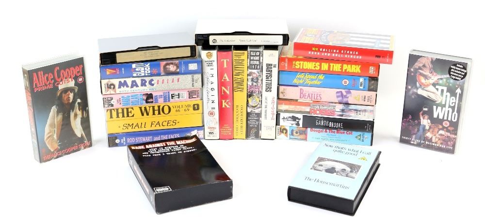 VHS tapes including bootleg compilations of The Who, Rolling Stones, Small Faces, commercial tapes including Marc Bolan, John Lennon, The Beatles, Isle of Wight Festival 1970, Rod Stewart, Alice Cooper, lots of Rolling Stones and more