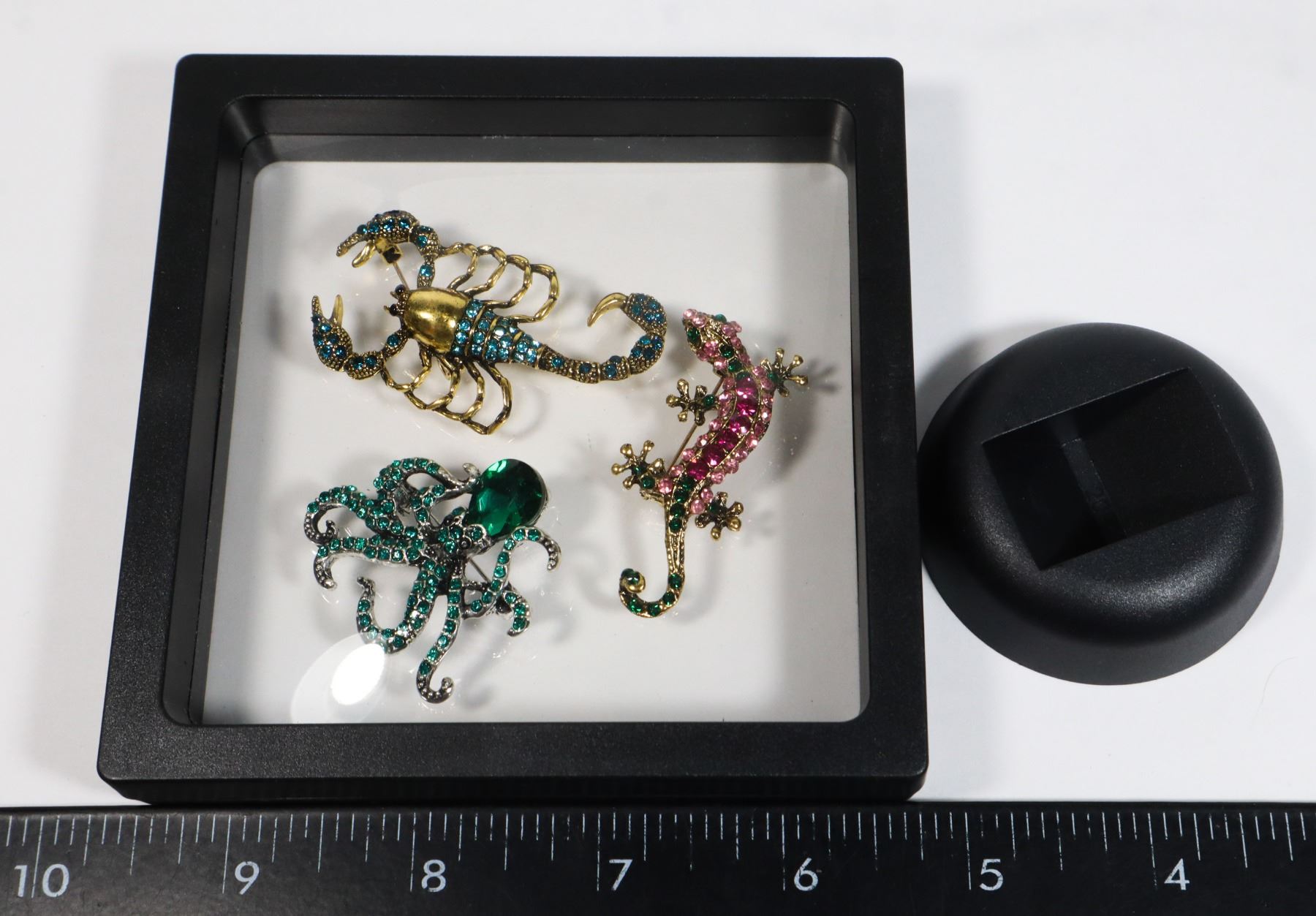 LAKE BLUE SCORPION BROOCHES -SPARKLING RHINESTONES- FLOATING CASE WITH SAND. CASE CAN BE REUSED WITH HELP OF HOT AIR BLOWER