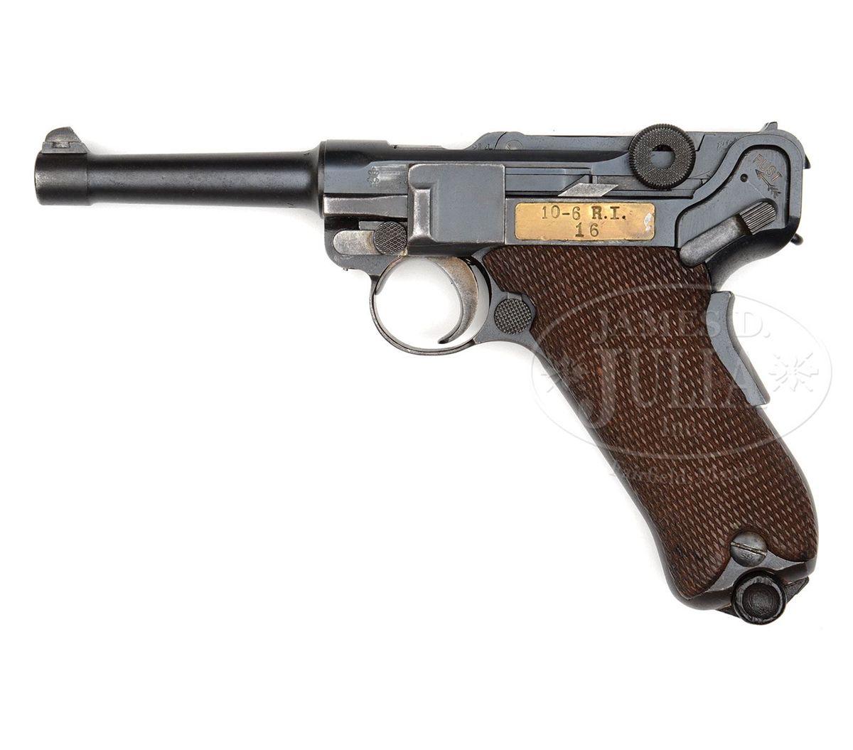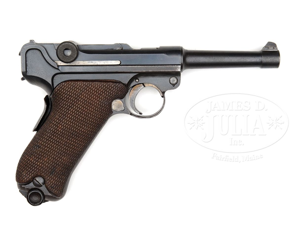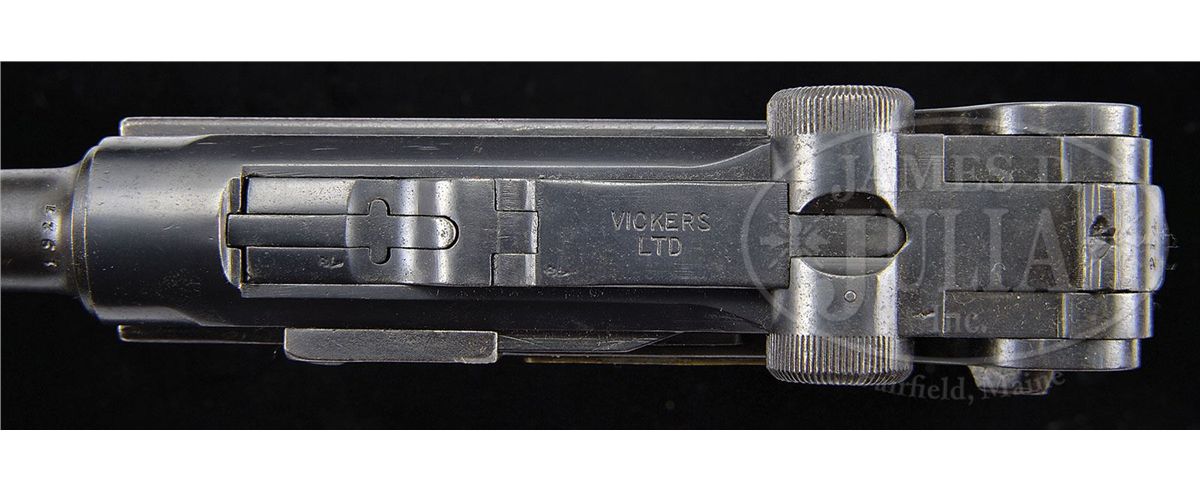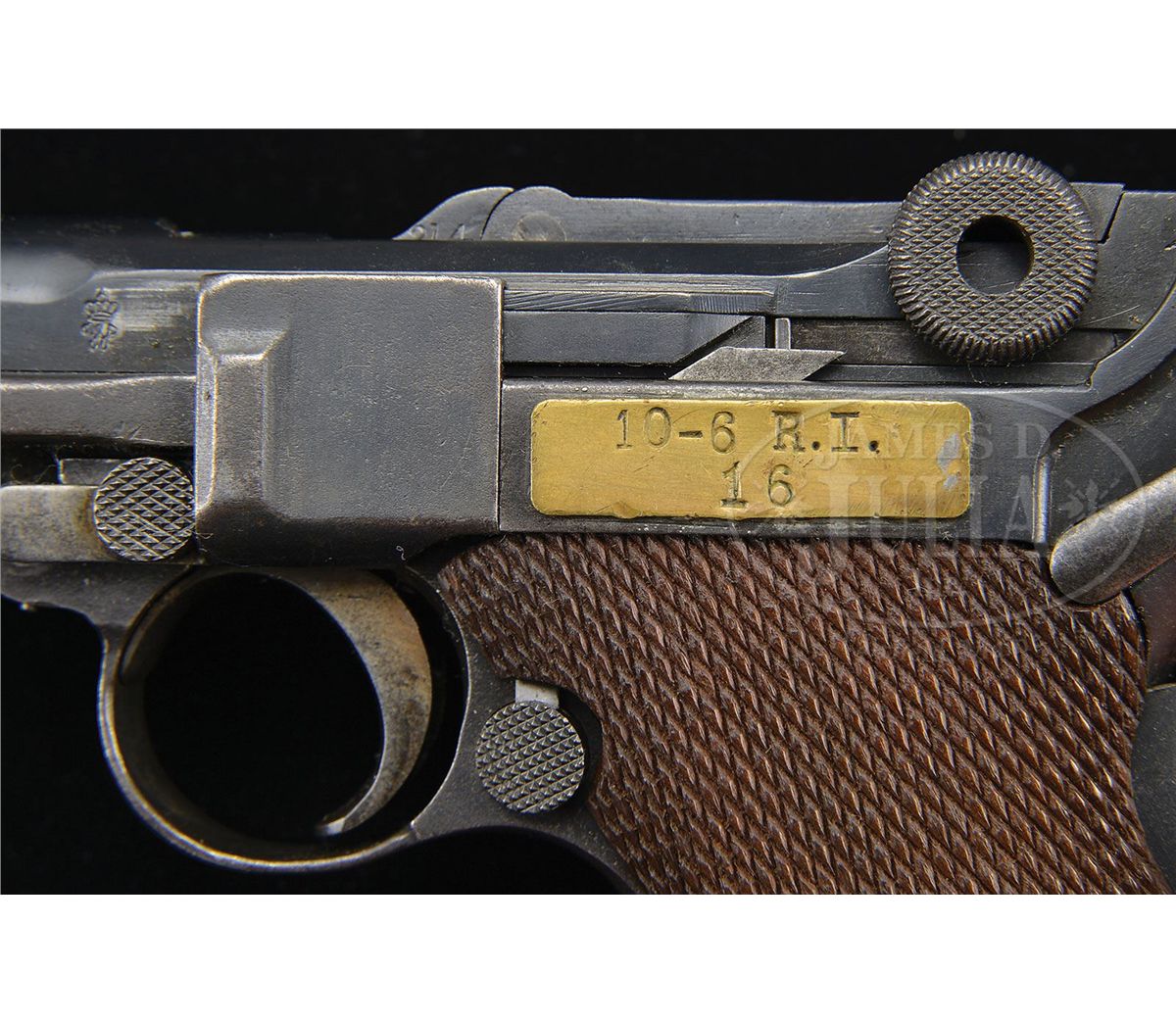 SN 9214. 4" 9mm bbl is dated "1927" on the top, indicating the year it was issued. "VICKERS LTD" on center toggle link. Crown/W on left side of receiver. "RUST" marked safety. Brass unit marking plate with "10-6 R.I. 16" (Pistol Number 16 of the 10th Battalion of the 6th Infantry Regiment). Gun has grip safety. Checkered walnut grips. All numbered parts are matching except for the right grip which is a proper Vickers Dutch grip but is internally mismatched. Left grip is a matching numbered replacement by Geweermakers School and is marked "GS", as is the left grip screw which they also replaced. Rare proper Dutch magazine with wood bottom and proper locking spring clip. This gun is featured on pp. 558, 690, 692, and 693 of Dr. Geoffrey Sturgess' The Borchardt & Luger Automatic Pistols. PROVENANCE: Collection of Dr. Geoffrey Sturgess. CONDITION: Fine retaining about 60% original blue which is bright in some places and fading to brown on the gripstraps and grip safety (common condition for Dutch Lugers). Original straw is about 40%. Bore has light wear and light pitting. Grips are moderately worn with a few chips and indents in the checkering. Magazine is very good with some corrosion on the body and a few minor dings in the wood bottom. Mechanics are sound. 4-52878 BWS35