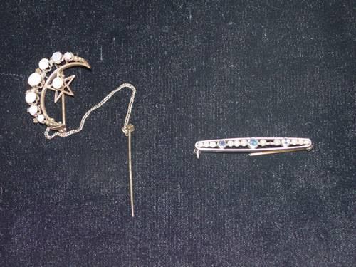 VICT. CRESCENT MOON and STAR PIN SET W/ MOONSTONES TOGETHER W/ SEED PEARL and SAPPHIRE BAR PIN (MISSING 1 PEARL);