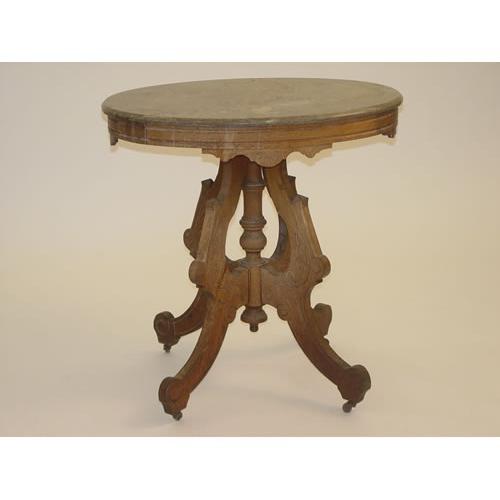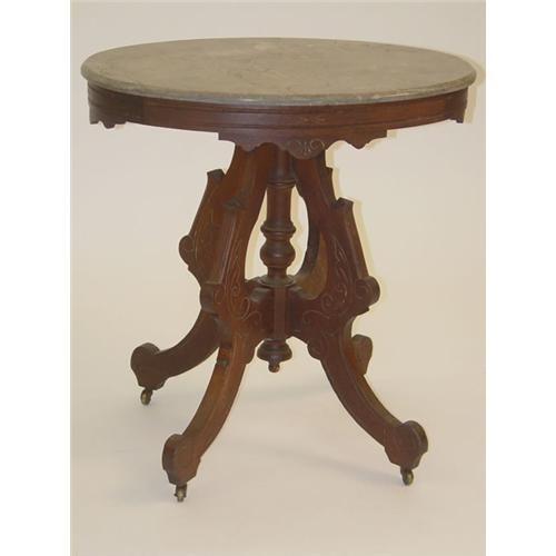 VICT. MARBLE TOP BLACK WALNUT LAMP TABLE - RENAISSANCE REVIVAL STYLE W/ GREY OVAL MARBLE TOP & CARVED BASE (29 1/4" T X 28 3/4" L X 20 1/2" W) - WEAR, STAINS, IMPERFECTIONS