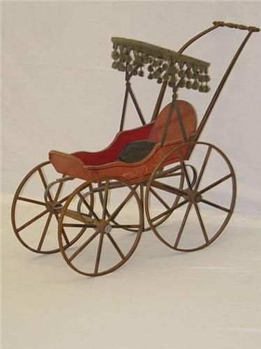 VICT. PAINT DECORATED DOLL STROLLER W/ SURRY TOP and FRINGE - WEAR;