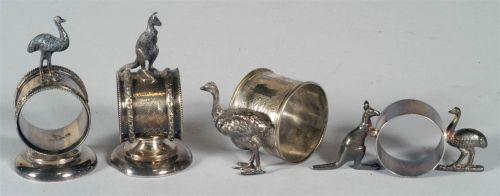 VICT SILVERPLATE NAPKIN RINGS FOUR: Ostrich astride a ring, Kangaroo on ring, Ostrich and ring and Ostrich and Kangaroo with ring between them, CONDITION: excellent, no damage or repairs, 3 monogrammed. PACKING AND SHIPPING BY FAIRFIELD AUCTION WITHIN CONTINENTAL USA (excluding insurance) $20- we will discount for combined shipping on multiple lots,