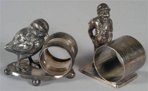 VICT SILVERPLATE NAPKIN RINGS Large Chick, Meriden #222 and Monkey with hat, James Tufts #144, CONDITION: monogrammed inside ring, excellent, no damage or repairs. PACKING AND SHIPPING BY FAIRFIELD AUCTION WITHIN CONTINENTAL USA (excluding insurance) $20- we will discount for combined shipping on multiple lots,