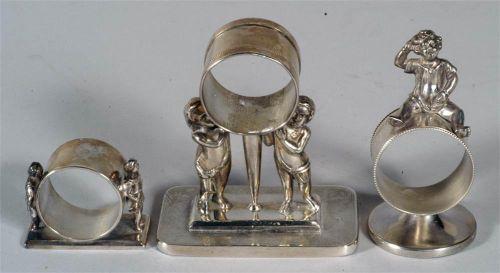 VICT SILVERPLATE NAPKIN RINGS THREE: Two Cupids, Reed & Barton #1220, together with Soldiers with bugles, Middletown #340 together with Crying Child, CONDITION: excellent, no damage or repairs. PACKING AND SHIPPING BY FAIRFIELD AUCTION WITHIN CONTINENTAL USA (excluding insurance) $20- we will discount for combined shipping on multiple lots,