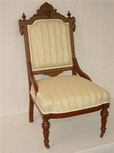 VICT. WALNUT PARLOR CHAIR W/ CAMEO GOTHIC HEAD ON BACK CREST - REFINISHED and IMPERFECTIONS;