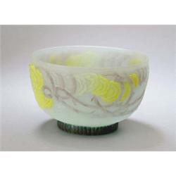 Pâte-de-verre in Zartgrün, mehrtonigem Gelb, Weiß, Violett und Rotbraun, partiell poliert. Umlaufendes reliefiertes Rosendekor mit stilisiertem dornigem Stengelwerk. Über zylindrischem, geripptem Fußring gewölbte hohe Schale mit abgesetztem Dekorfries. H.: 9,8, Ø 16 cm. Bez.: Auf der Wandung bez.: WALTER NANCY sowie LEJAN. Um 1920 Lit.: Glas des Art Noveau und Art Déco. Ausst.kat. Museum Bellerive Zürich, Zürich 1986, S. 106, Nr. 143, S. 45, Abb. 26