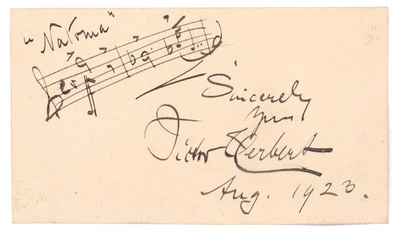 VICTOR AUGUST HERBERT (1859 - 1924) Cellist, conductor and composer best known for his light operas. AMQS. 4 3/4” x 2 3/4”. Aug. 1923 Mounting trace on verso. Fine.