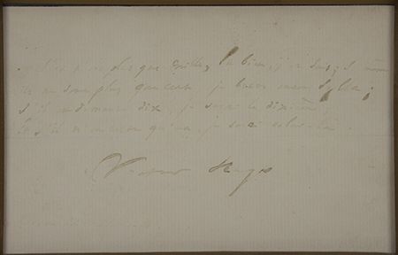(1802 - 1885) French writer and author of the classics Notre Dame de Paris, Les Miserables, and much poetry. A.L.S. "Victor Hugo" 1p. oblong 8vo., [n.p., n.d.] in French. Quite faded, but apparently an invitation. As noted, signature and writing are quite faded but still somewhat legible. Framed with an image of Hugo. Not examined out of frame. Estimated accordingly.