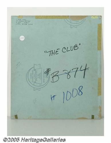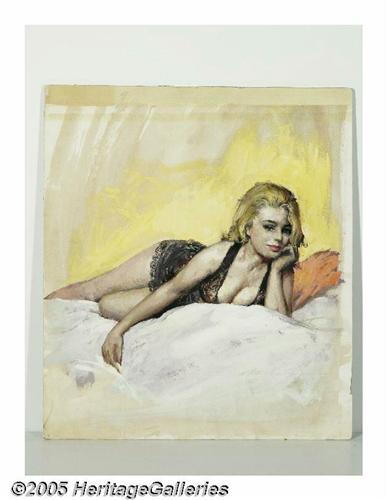 <B>VICTOR OLSON (American 20th Century)</B></I> <BR>Original Paperback Cover Illustration <BR>The Club by Steve Yardley, 1965 <BR>Oil on board <BR>18in. x 18in.<BR>Not signed <BR><BR>This sultry scene was painted for one of the notorious Beacon adult paperbacks, #B874X.<BR>