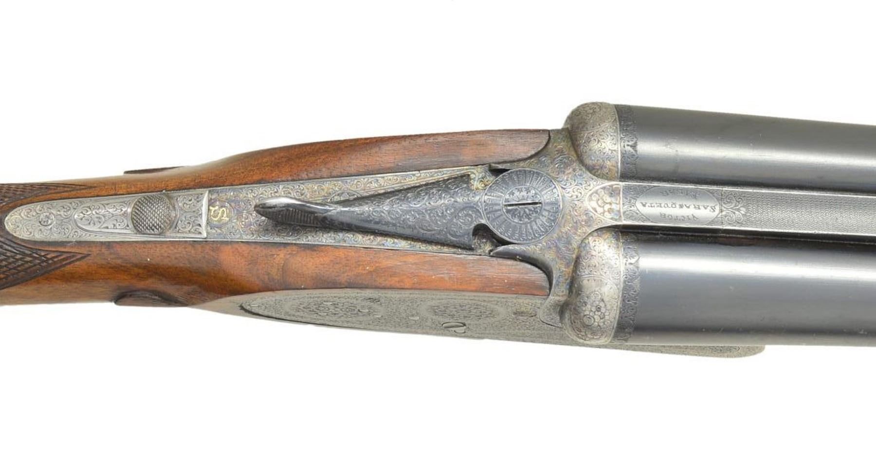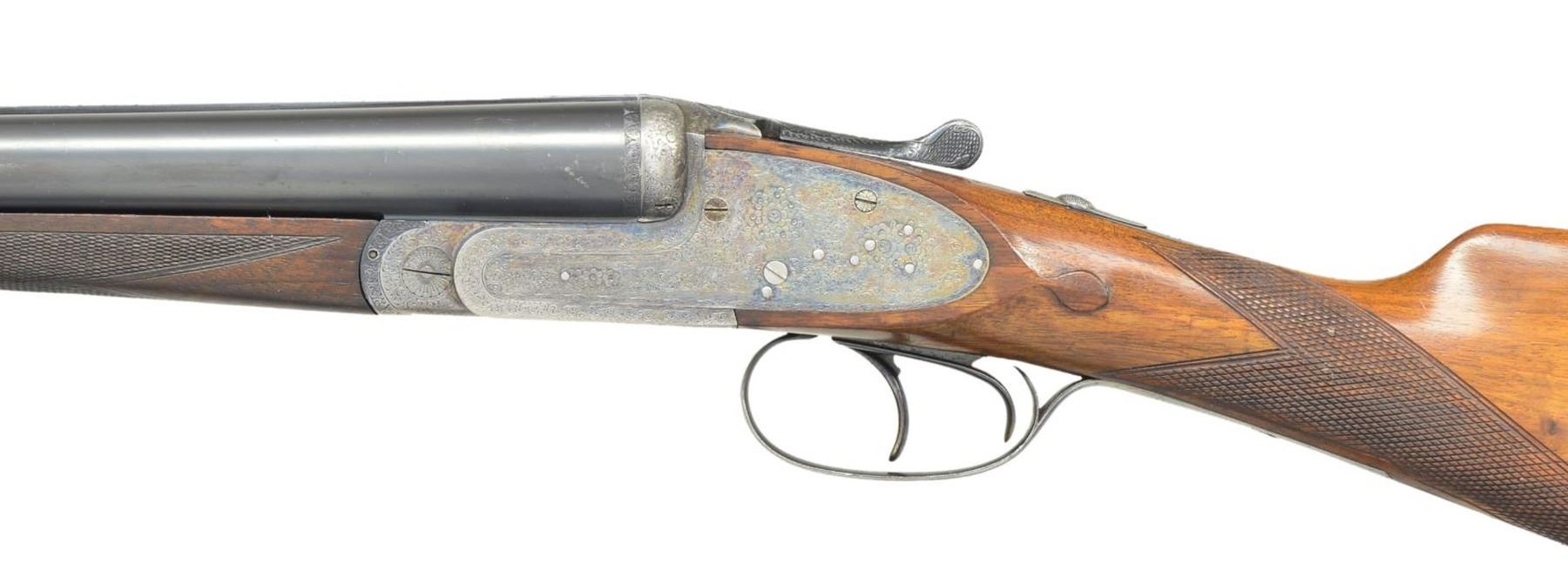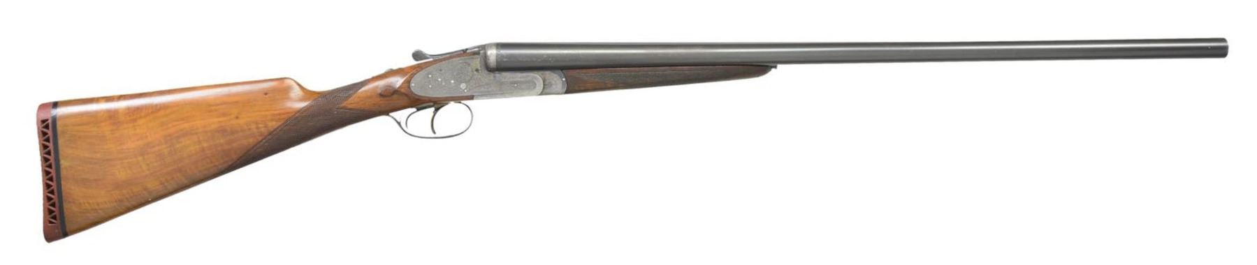 Cal. 12 Ga. S# 70252. Bbl. 27-2/4" w/ concave solid rib. Case colored sidelock action w/ full coverage English style rose & scroll engraving. Features include double under lug & third fastener locking. Bushed firing pins. Pin type cocking indicators & ejectors. Double triggers, right trigger is hinged. Splinter forearm w/ Anson release. Straight hand stock of nicely grained European walnut w/ hand checkering & tear drop points. LOP: 14-1/8" over a red ventilated pad. DAC: 1-1/4". DAH: 2-1/8". Neutral cast. Bore diameter: RT .734", LT .737". Choke constriction: RT .010", LT .040". Minimum wall thickness: RT .022", LT .018". WEIGHT: 6 lbs, 14 ozs. Bbl. date code indicates 1939 mfg. CONDITION: bbls. retain 90% blue showing light wear marks. Action has 70% case color showing fading in carry areas. Trigger guard shows handling wear. Forearm has dark oil soaked appearance w/ moderate checkering wear. Stock has good finish & checkering showing small marks. Action is tight & on face. Right bbl. shows scattered spots of pitting. Left bbl. has good bright bore. (23-708/DS). CURIO. $1,000-1,500.