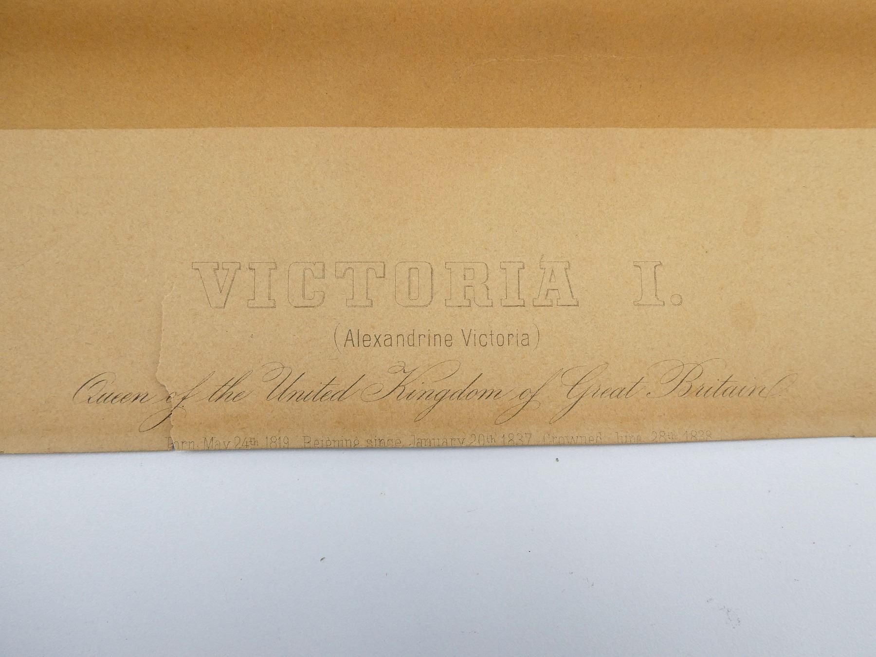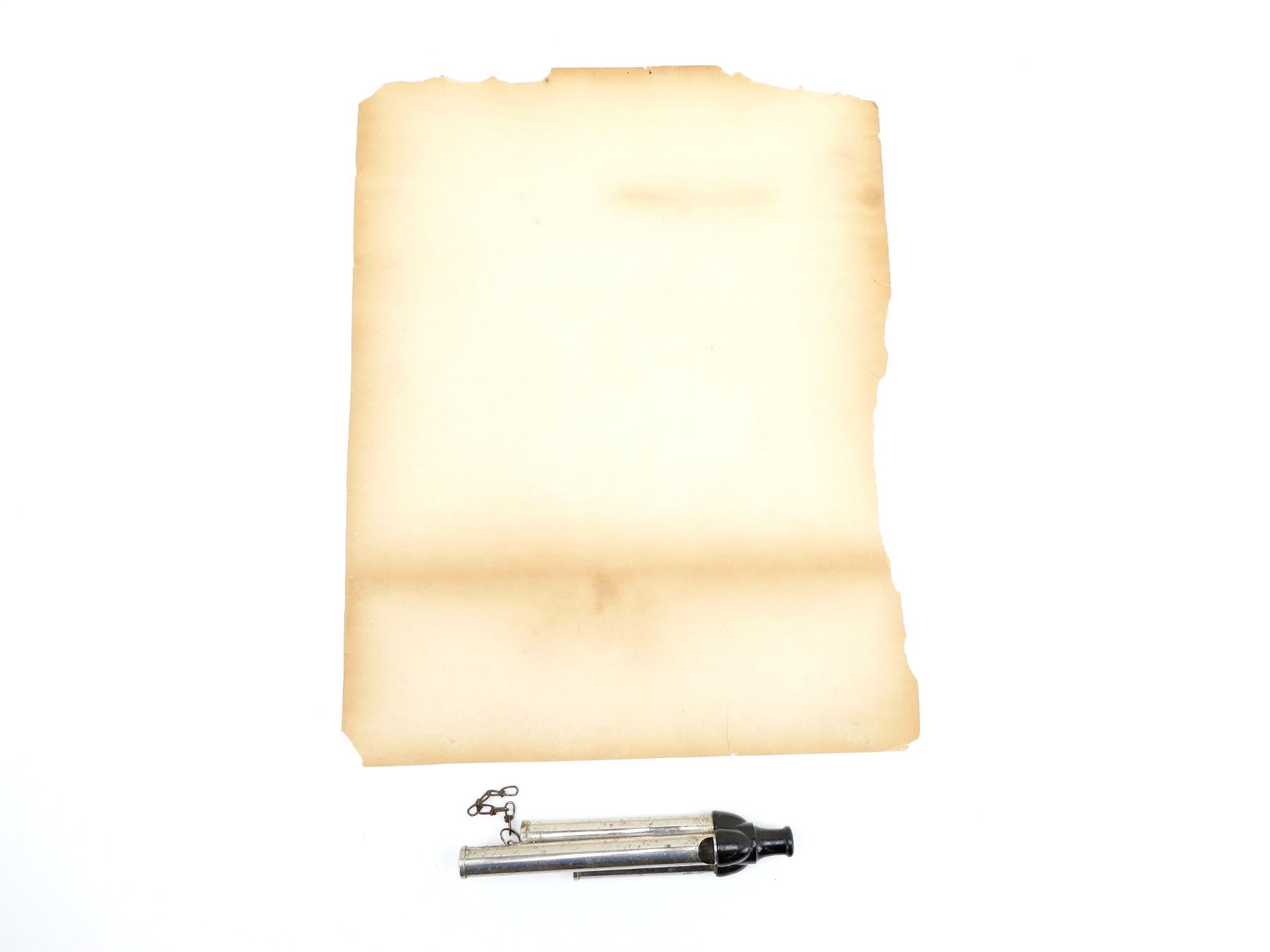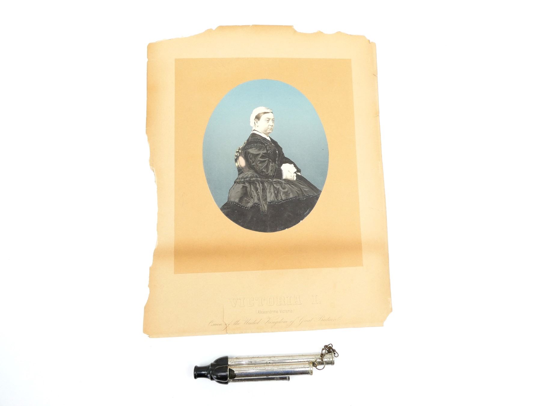LOT INCLUDES; (1) "VICTORIA, I, (ALEXANDRINE VICTORIA)" PRINT, ALSO MARKED: "QUEEN OF THE UNITED KINGDOM OF GREAT BRITAIN, BORN MAY 24TH 1819, REIGNING SINCE JANUARY 20TH 1837, CROWNED JUNE 28TH 1838", SHOWS AGE / WEAR / TEAR, TORN AROUND ALL EDGES, APPROX. 12" X 15 5/8" & (1) BRITISH WHISTLE, STEEL / POLYMER CONSTRUCTION, MARKED: "ENGLAND", OAL APPROX. 6 5/8". SEE PHOTOS.