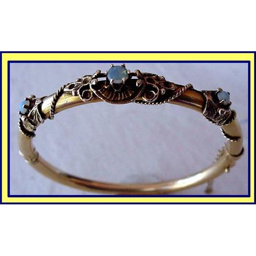 Antique Victorian bracelet made of 14 karat gold with applied and overlaid gold and set with 3 round opals.<BR>Marked 14K in the hinge.<BR>Tubular bracelet with comfortable, but very secure locking system and safety chain. Fine sculpted gold applied to the surface as well as filigree type gold wire. Beautiful colouring of antique opals. <BR>Condition is excellent. Looks fabulous on the arm.