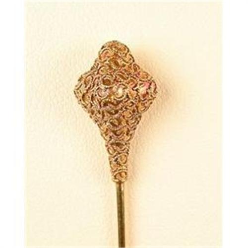 THIS ANTIQUE VICTORIAN GOLD STICKPIN IS CIRCA 1870 AND IT IS IN EXCELLENT CONDITION! It is a 14K Yellow Gold Stickpin done in the ETRUSCAN REVIVAL STYLE. The 14k Gold head is covered in CANNETILLE or 'VERMICELLI' Ropes. The head of this VICTORIAN STICKPIN is in a rough 'cruciform' shape. It has the MAKERS MARK and it IS in EXCELLENT CONDITION!