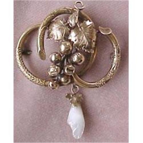 This is a lovely Victorian 14K yellow gold brooch with natural free-form pearl drop, c. 1880-1890. The gold has very nice etching work and a lovely patina. The pin back findings are in basemetal, which is typical of the period, and the clasp has been replaced with safety c.1910 style swivel. Overall condition is very good - some of the grapes have small dings.