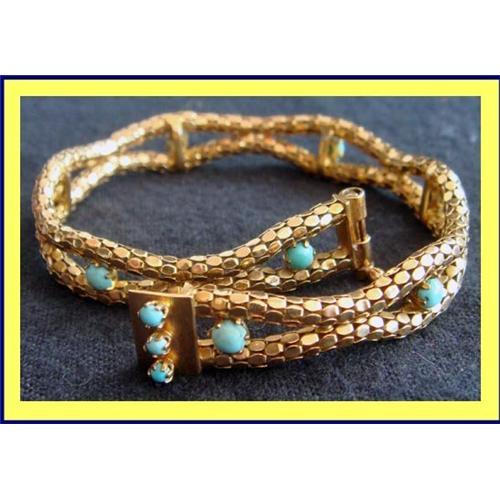 Very pretty bracelet in form of a double wave with a turquoise set inbetween each curve. The gold is made of scale-like links, wonderfully articulate and