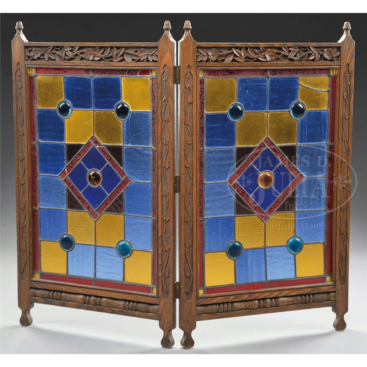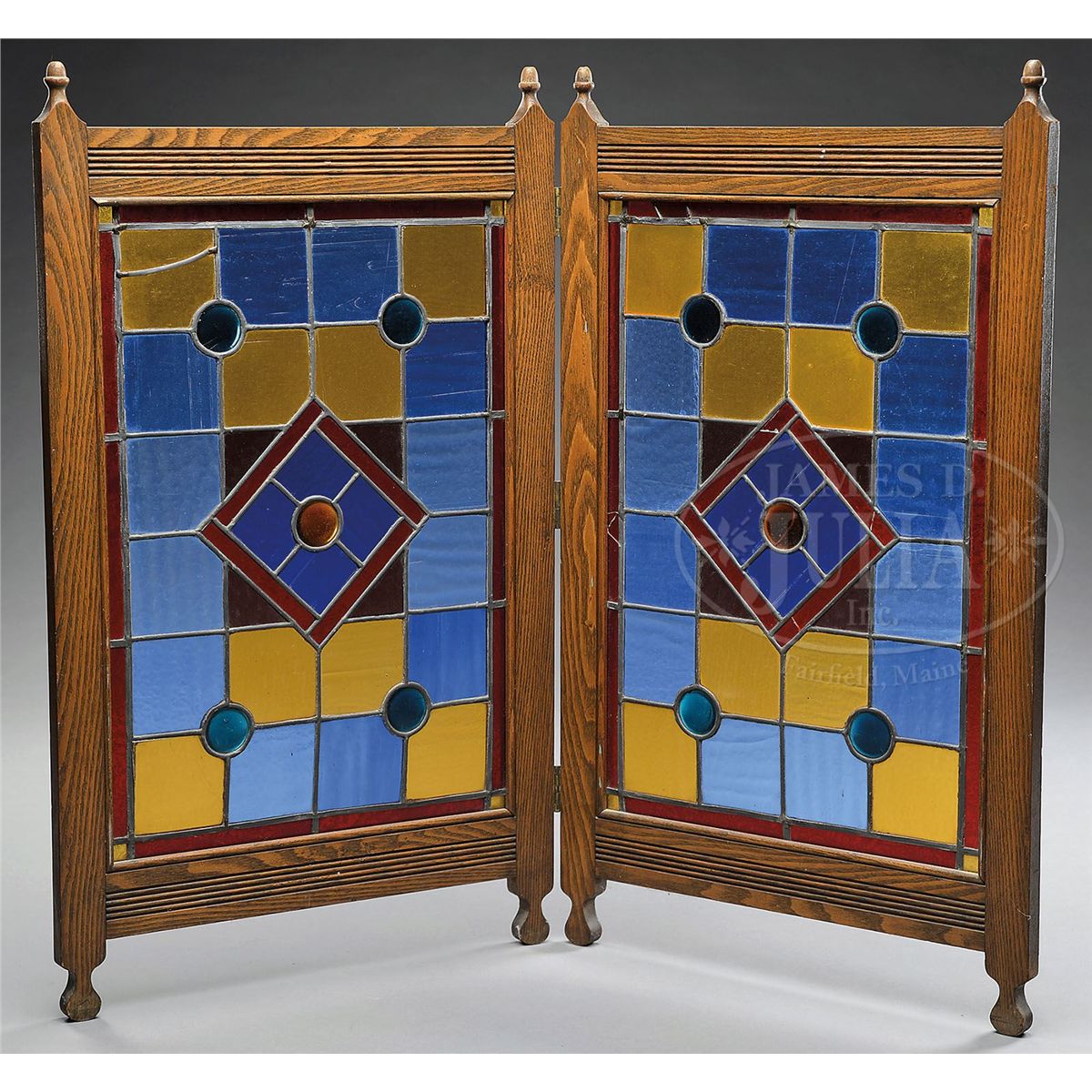 Two panel, footed oak frame having acorn finials above foliate carved relief borders, the leaded, stain glass geometric designed panels of marigold , and blue are inset with aqua colored bull's eyes and cranberry borders. SIZE: Each panel (glass): 27 1/2" x 25 1/4" Overall: 36 1/2" x 21 3/4" CONDITION: One acorn drilled, old lead repairs to a marigold panel and a cranberry border, three cracks in cranberry border. 7-70516