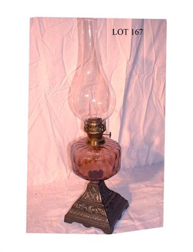 19TH C. AMETHYST GLASS OIL LAMP RAISED ON AN ORNAMENTALLY CAST BASE, 22" H, WEIGHING 3.0 LBS.