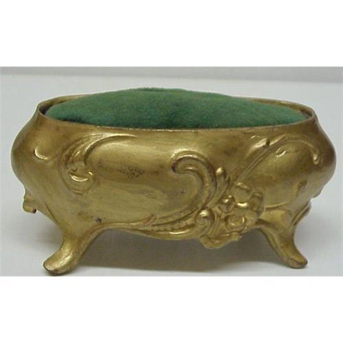 BEAUTIFUL OLD PINCUSHION, MADE FROM CAST METAL IN ART NOUVEAY STYLE - IT HAS NUMBER 175 ON THE BOTTOM, EXCELLENT AS FOUND CONDITION - MEASURES ABOUT 4 1/4" X 2" , - US BUYER TO PAY 8.00 PLUS INSURANCE.THANKS!