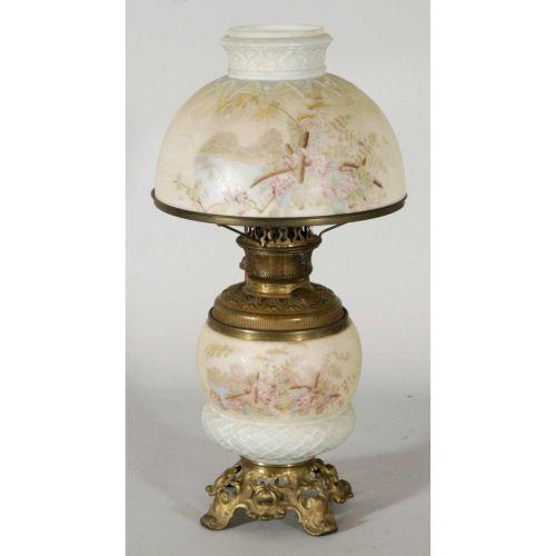 VICTORIAN BANQUET LAMP attributed to Mt Washington Glass, 20" high, original oil, CONDITION: excellent, PACKING AND SHIPPING: Fairfield Auction will provide packing and shipping (excluding insurance) within the Continental U.S. for $50. Buyer is welcome to use any other service or pick-up at the gallery.
