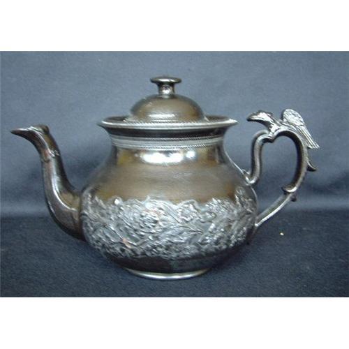Black glazed teapot with moulded decoration of flowers around the body and eagle on the finial . Some very tiny chipping on the edge of the spout and a tiny chip on the rim . Postage and packing to USA $24.00 , GB £ 6.00