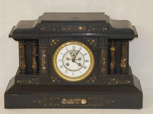 VICTORIAN BLACK MARBLE MANTLE CLOCK W/ INLAY DECORATION-NO MAKER - SMALL CHIPS TO MARBLE ON BACK SIDE BOTTOM EDGE, WEAR & IMPERFECTIONS