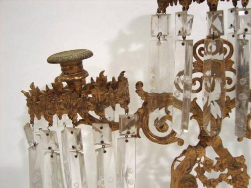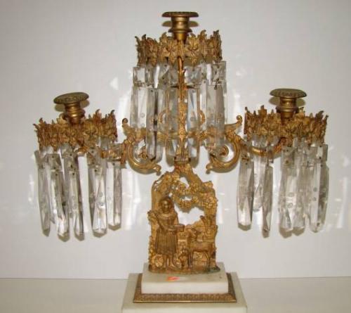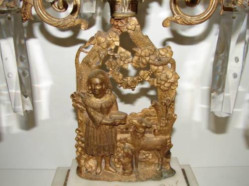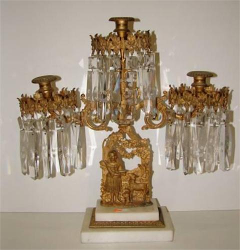 VICTORIAN BRASS 3 LITE CANDELABRA. Marble base with brass candelabra with relief scene of girl with deer and dog at stem. Each lite has 9 etched glass prisms. Two prisms are missing. 17.25" H