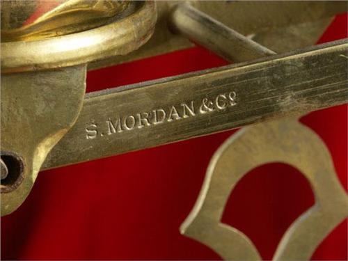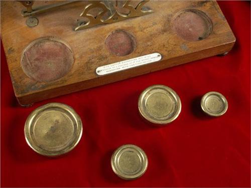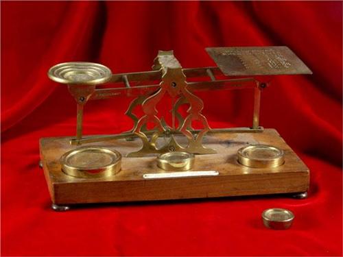 ENGLISH POSTAGE SCALE: Brass and walnut ''S. Mordan & Co.'' English postage scale with brass weights 2 oz, 4 oz, 8 oz, and 16 oz and scale on walnut base with bun feet. Victorian, circa 1880. Measures 10 1/2''L x 5 1/2''W x 6''H. Some denting to brass weights and patina commensurate with age.