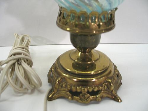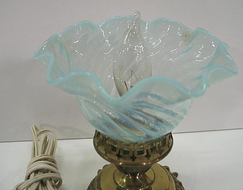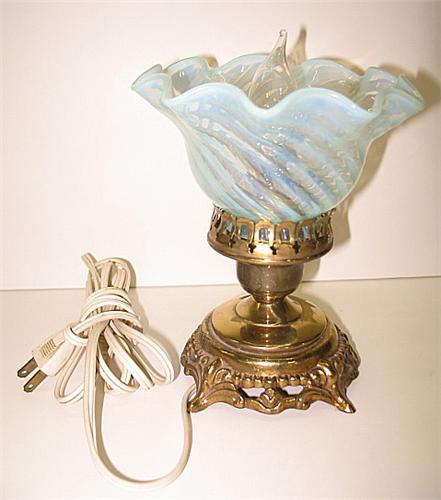 VICTORIAN BRASS FAIRY LAMP. Electrified. Fluted blue opalescent glass shade. 7" H