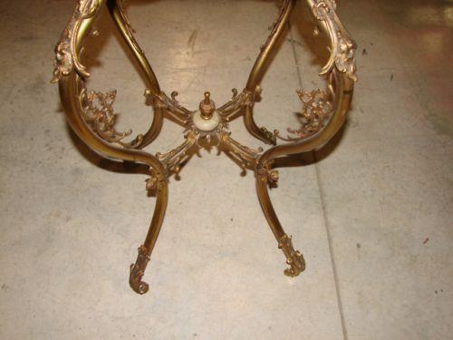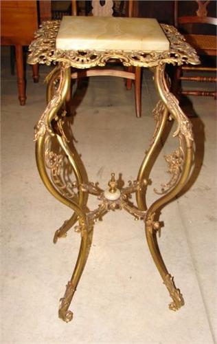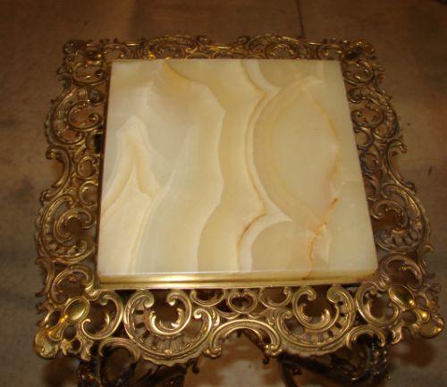 ORNATE VICTORIAN BRASS & MARBLE PLANT STAND. Amber marble top and finial base. 32.5” H, 16” x 16”